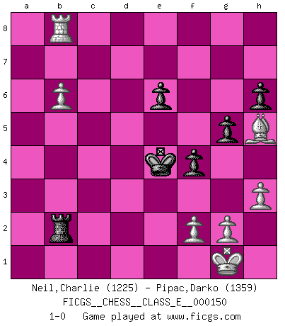 Last move : 1-0 2012 May 31 10:39:30 [Event "FICGS__CHESS__CLASS_E__000150"] [Site "FICGS"] [Date "2012.04.06"] [Round "1"] [White "Neil,Charlie"] [Black "Pipac,Darko"] [Result "1-0"] [WhiteElo "1225"] [BlackElo "1359"] 1.d4 d5 2.c4 c6 3.Nc3 Nf6 4.Bg5 e6 5.e3 h6 6.Bh4 Bb4 7.Bd3 O-O 8.Nf3 dxc4 9.Bxc4 Nbd7 10.O-O Qa5 11.Qb3 Bxc3 12.bxc3 Ne4 13.Be7 Re8 14.Bb4 Qb6 15.Rac1 c5 16.Ba3 Qxb3 17.axb3 cxd4 18.exd4 b6 19.Rfe1 Bb7 20.Re3 Ndf6 21.Bd3 Rac8 22.c4 Red8 23.Be7 Rd7 24.Bxf6 Nxf6 25.Ne5 Rxd4 26.h3 Rcd8 27.Bc2 Nd7 28.Nf3 Bxf3 29.Rxf3 Nc5 30.b4 Nd7 31.Bb3 Ne5 32.Rg3 Rc8 33.b5 Nxc4 34.Rgc3 Nd6 35.Rxc8+ Nxc8 36.Rxc8+ Kh7 37.Rc7 Kg6 38.Rxa7 Rb4 39.Bc2+ f5 40.Bd3 Kf6 41.Be2 g5 42.Ra6 Ke5 43.Rxb6 Rb2 44.Bh5 f4 45.Rb8 Ke4 46.b6 1-0 QGD Slav defense Kingside Castling by player Black (move 7) Kingside Castling by player White (move 10) Player White won this chess game. Follow this game move after move (download)Chess is a terrible game. If you have no center, your opponent has a freer position. If you do have a center, then you really have something to worry about ! (Siegbert Tarrasch) Rubinstein ist ein Turmendspiel, welches die Götter vor tausenden von Jahren begannen. (Savielly Grigorievitsch Tartakower) Cuando veas una buena jugada, trata de encontrar otra mejor. (Emanuel Lasker) Vous n'êtes pas toujours obligé de jouer le meilleur coup. Un coup doit être actif, entreprenant, correct et beau ! (David Bronstein) A mistake is only a mistake if you let it happen twice. Otherwise it is a learning experience. (Daniel Parmet)