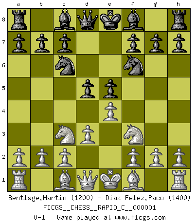 Last move : 0-1 2006 July 10 1:13:32 [Event "FICGS__CHESS__RAPID_C__000001"] [Site "FICGS"] [Date "2006.05.12"] [Round "1"] [White "Bentlage,Martin"] [Black "Diaz Felez,Paco"] [Result "0-1"] [WhiteElo "1200"] [BlackElo "1400"] 1.e4 e5 2.Nf3 Nc6 3.Nc3 Nf6 4.d3 d5 0-1 This chess game has been lost on time (started : 2006.05.12 15:29:17) Four knights game Player Black won this chess game. Follow this game move after move (download)The stomach is an essential part of the Chess master. (Bent Larsen) Über Kasparov: Es ist offensichtlich, daß er in einem totalitären Staat aufwuchs und deshalb zu diktatorischen Zügen neigt. (Viktor Kortschnoi) Debemos de asegurarnos de que el Ajedrez no se convierta en un lenguaje muerto, muy interesante, pero tan solo para un grupo muy pequeño. (Sytze Faber) Il n'y a plus de joueurs du niveau de Jacob Murray dont la seule quête est le beau jeu, le plaisir de voir les pièces construire quelque chose. Sur 10 idées à la minute, 9 seront sans intérêt, la dernière s'avèrera géniale. (Christian Bauer) It is not true that people stop pursuing dreams because they grow old, they grow old because they stop pursuing dreams. (Gabriel Garcia Marquez)