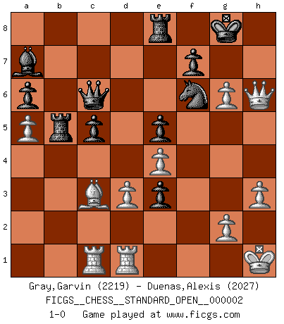 Last move : 1-0 2012 June 3 12:21:27 [Event "FICGS__CHESS__STANDARD_OPEN__000002"] [Site "FICGS"] [Date "2012.04.08"] [Round "1"] [White "Gray,Garvin"] [Black "Duenas,Alexis"] [Result "1-0"] [WhiteElo "2219"] [BlackElo "2027"] 1.e4 e5 2.Nf3 Nc6 3.Bc4 Nf6 4.d3 Bc5 5.c3 d6 6.Nbd2 O-O 7.O-O a6 8.Bb3 h6 9.Nc4 Ba7 10.h3 Be6 11.a4 Re8 12.Re1 Ne7 13.Ne3 Qc8 14.a5 Ng6 15.Bxe6 Qxe6 16.c4 Nf4 17.Nd5 N4xd5 18.cxd5 Qe7 19.Bd2 c6 20.dxc6 bxc6 21.Nh4 Rab8 22.b4 g6 23.Rc1 Qb7 24.Bxh6 Qxb4 25.Bg5 Nh7 26.Bd2 Qb7 27.Nf3 Bc5 28.Bc3 Nf6 29.Rc2 Ba7 30.Qc1 Qd7 31.Qg5 Nh7 32.Qh6 Rb5 33.R2c1 Nf8 34.Red1 c5 35.Nh2 Nh7 36.Ng4 Qe6 37.Ne3 Nf6 38.Kh2 d5 39.f4 d4 40.f5 Qc6 41.fxg6 dxe3 42.Kh1 1-0 Two knights defense (Modern Bishop's Opening) Kingside Castling by player Black (move 6) Kingside Castling by player White (move 7) Player White won this chess game. Follow this game move after move (download)A thorough understanding of the typical mating continuations makes the most complicated sacrificial combinations leading up to them not only not difficult, but almost a matter of course. (Siegbert Tarrasch) Die westlichen Werte sind eine Sprache, welche die Putin-Administration nicht versteht. (Garry Kasparov) Tu puedes aprender mucho mas de una partida que pierdas que de una partida ganada. Tendras que perder cientos de partidas antes de llegar a ser un buen jugador. (Jose Raul Capablanca) Mais n'est-ce pas déjà le limiter injurieusement que d'appeler les échecs un jeu? N'est-ce pas aussi une science, un art, ou quelque chose qui, comme le cercueil de Mahomet entre ciel et terre, est suspendu entre l'un et l'autre, et qui réunit un nombre incroyable de contraires ? (Stefan Zweig) A computer lets you make more mistakes faster than any invention in human history - with the possible exceptions of handguns and tequila. (Mitch Ratcliffe)