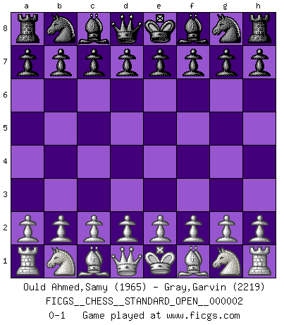 Last move : 0-1 2012 May 19 1:36:10 [Event "FICGS__CHESS__STANDARD_OPEN__000002"] [Site "FICGS"] [Date "2012.04.08"] [Round "1"] [White "Ould Ahmed,Samy"] [Black "Gray,Garvin"] [Result "0-1"] [WhiteElo "1965"] [BlackElo "2219"] 0-1 This chess game has been lost on time (started : 2012.04.08 15:49:7) Player Black won this chess game. Follow this game move after move (download)Pawns: they are the soul of this game, they alone form the attack and defense. (Philidor) Schachspieler können ausgezeichnet Varianten am Schachbrett berechnen, aber nicht im realen Leben. Zu stark ist der Individualismus im Schach ausgeprägt, und für viele ist ein kleiner momentaner persönlicher Vorteil wichtiger als ein weit größerer Vorteil von morgen. (Anatoly Karpov) ¿Que sería del Ajedrez sin errores graciosos?. (Kurt Richter) Donnez-moi un Cavalier en 6e et je gagnerais toutes mes parties. (Steinitz) Never was anything great achieved without danger. (Niccolo Machiavelli)
