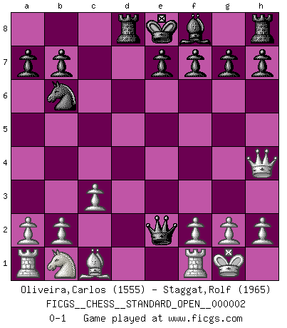 Last move : 0-1 2012 August 25 12:56:39 [Event "FICGS__CHESS__STANDARD_OPEN__000002"] [Site "FICGS"] [Date "2012.04.08"] [Round "1"] [White "Oliveira,Carlos"] [Black "Staggat,Rolf"] [Result "0-1"] [WhiteElo "1555"] [BlackElo "1965"] 1.e4 c5 2.c3 Nf6 3.e5 Nd5 4.d4 cxd4 5.Nf3 Nc6 6.Bc4 Nb6 7.Bb3 d5 8.exd6 Qxd6 9.O-O Be6 10.Bxe6 Qxe6 11.Nxd4 Nxd4 12.Qxd4 Rd8 13.Qh4 Qe2 0-1 Sicilian : Alapin's variation (2.c3) Kingside Castling by player White (move 9) Player Black won this chess game. Follow this game move after move (download)Checkers is for tramps. (Paul Morphy) Wenn Capablanka heute auf der Schachbühne erscheinen würde, hätte er ein halbes Jahr gebraucht um sich die Schachtheorie anzueignen. Und dann hätte er alles und jeden besiegt. (Mikhail Moiseyevich Botvinik) El Ajedrez es sobre todo, ¡una pelea!. (Emanuel Lasker) Psychologiquement, tu dois avoir confiance en toi même, mais cette confiance doit être basée sur des faits. (Robert Fischer) There is no instance of a country having benefited from prolonged warfare. (Sun Tzu)