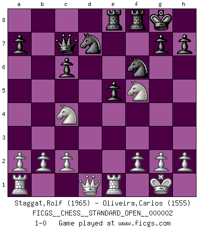 Last move : 1-0 2012 November 12 22:31:18 [Event "FICGS__CHESS__STANDARD_OPEN__000002"] [Site "FICGS"] [Date "2012.04.08"] [Round "2"] [White "Staggat,Rolf"] [Black "Oliveira,Carlos"] [Result "1-0"] [WhiteElo "1965"] [BlackElo "1555"] 1.e4 c6 2.d4 d5 3.Nc3 dxe4 4.Nxe4 Bf5 5.Nc5 e5 6.Nxb7 Qb6 7.Nc5 exd4 8.Nb3 Bb4+ 9.Bd2 Nd7 10.Nf3 Bxd2+ 11.Nfxd2 Be6 12.Bc4 Ngf6 13.O-O O-O 14.Bxe6 fxe6 15.Nc4 Qc7 16.Nxd4 Rae8 17.Re1 e5 18.Nf5 1-0 This chess game has been lost on time (started : 2012.04.08 15:49:7) Caro-Kann : Classical variation Kingside Castling by player White (move 13) Kingside Castling by player Black (move 13) Player White won this chess game. Follow this game move after move (download)The most important feature of the Chess position is the activity of the pieces. This is absolutely fundamental in all phases of the game: Opening, Middlegame and especially Endgame. The primary constraint on a piece's activity is the Pawn structure. (Michael Stean) Ein Isolani verdüstert die Stimmung auf dem ganzen Schachbrett. (Savielly Grigorievitsch Tartakower) El Ajedrez es 99 por ciento táctica. (Teichmann) Il vaut toujours mieux jouer un plan faux de façon logique que de n'avoir pas de plan du tout. (Victor Kortchnoï) The absolute truth is the thing that makes people laugh. (Carl Reiner)