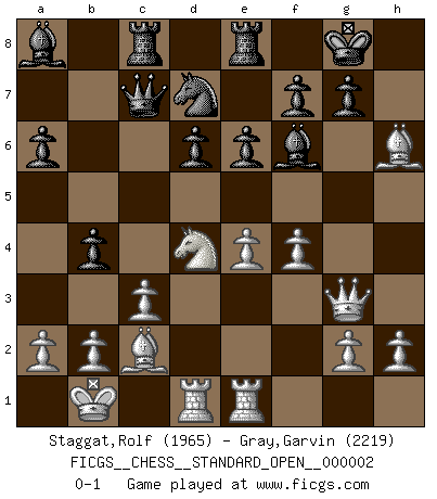 Last move : 0-1 2012 December 27 19:4:43 [Event "FICGS__CHESS__STANDARD_OPEN__000002"] [Site "FICGS"] [Date "2012.04.08"] [Round "1"] [White "Staggat,Rolf"] [Black "Gray,Garvin"] [Result "0-1"] [WhiteElo "1965"] [BlackElo "2219"] 1.e4 c5 2.Nf3 Nc6 3.d4 cxd4 4.Nxd4 Nf6 5.Nc3 d6 6.Bg5 e6 7.Qd2 a6 8.O-O-O h6 9.Be3 Bd7 10.f3 b5 11.Nxc6 Bxc6 12.Bd3 Be7 13.Kb1 Nd7 14.Rhe1 O-O 15.Ne2 Rc8 16.Nd4 Ba8 17.c3 Re8 18.Bc2 Qc7 19.Qf2 Ne5 20.Qg3 Bf6 21.Bxh6 b4 22.f4 Nd7 0-1 Sicilian defense Queenside Castling by player White (move 8) Kingside Castling by player Black (move 14) Player Black won this chess game. Follow this game move after move (download)Chess is as much a mystery as women. (Purdy) Modernes Schach erfordert enorme Anspannung. Es ist für einen normalen Menschen unmöglich das auszuhalten. (Viktor Kortschnoi) Tu sabes, camarada Pachman, no disfruto el ser un Ministro, preferería jugar al Ajedrez como tu. (Che Guevara) Toute estimation doit être constamment réévaluée. (Jacob Estrin) My poor ole parrot... Is not in the circulation of displays ....poo hoo hoo :) (Wayne Lowrance's enigma)
