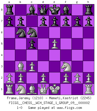 Last move : 1-0 2007 February 22 17:33:6 [Event "FICGS__CHESS__WCH_STAGE_1_GROUP_09__000002"] [Site "FICGS"] [Date "2007.01.16"] [Round "1"] [White "Frame,Jeremy"] [Black "Memeti,Kastriot"] [Result "1-0"] [WhiteElo "1210"] [BlackElo "2245"] 1.e4 c5 2.Nf3 Nc6 3.c3 Nf6 4.e5 Nd5 5.Bc4 Nb6 6.Bb3 1-0 This chess game has been lost on time (started : 2007.01.16 15:20:23) Sicilian defense Player White won this chess game. Follow this game move after move (download)When your house is on fire, you can't be bothered with the neighbors. Or, as we say in Chess, if your King is under attack you don't worry about losing a Pawn on the Queen's side. (Gary Kasparov) Es macht mich traurig, wenn ich sehe, dass Golfprofis mehr verdienen als Schachsportler. Obwohl ich davon überzeugt bin, dass wir Schachspieler viel härter trainieren müssen als die Golfer. (Alexandra Kosteniuk) Coloca el contenido del tablero de Ajedrez en un sombrero, agita las piezas vigorosamente, derrámalas en el tablero desde una altura de medio metro y así obtienes el estilo de Wilhelm Steinitz. (H. E. Bird) Il vaut mieux sacrifier les pièces de l'adversaire. (Xavier Tartacover) I would love to change the world, but they won't give me the source code. (Unknown)