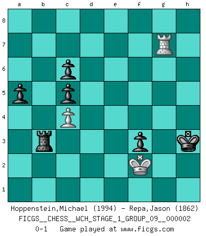 Last move : 0-1 2007 April 7 8:31:6 [Event "FICGS__CHESS__WCH_STAGE_1_GROUP_09__000002"] [Site "FICGS"] [Date "2007.01.16"] [Round "1"] [White "Hoppenstein,Michael"] [Black "Repa,Jason"] [Result "0-1"] [WhiteElo "1994"] [BlackElo "1862"] 1.d4 e6 2.Nf3 f5 3.g3 b6 4.Bg2 Bb7 5.O-O Nf6 6.c4 Be7 7.Nc3 O-O 8.Bf4 Ne4 9.Qc2 Nxc3 10.Qxc3 Bf6 11.Qe3 Be4 12.Rad1 Nc6 13.b3 a5 14.a3 Re8 15.Qc3 d6 16.Ne5 Bxg2 17.Kxg2 Bxe5 18.dxe5 g5 19.Qf3 Qd7 20.Bxg5 Nxe5 21.Qe3 a4 22.f3 Qf7 23.Qc3 axb3 24.Qxb3 Nd7 25.Be3 e5 26.Bf2 f4 27.Rg1 Re6 28.Kh1 Rg6 29.Rg2 Kf8 30.Rd5 Ke7 31.g4 Qe6 32.Rd1 Kd8 33.a4 Kc8 34.R2g1 Kb7 35.Qc2 e4 36.Rd4 Nc5 37.Rd5 Qe8 38.Bxc5 dxc5 39.Ra1 Re6 40.Qd1 Re7 41.Rf5 exf3 42.exf3 h6 43.Qd5+ c6 44.Qd1 Rd8 45.Qg1 Re2 46.a5 bxa5 47.Qb1+ Kc7 48.Rf6 Rd7 49.Rxh6 Qe3 50.Qe4 Qxe4 51.fxe4 f3 52.Rh3 Rd3 53.Rh7+ Kd6 54.g5 Ke5 55.g6 R3d2 56.Rg1 Rg2 57.g7 Rxg1+ 58.Kxg1 Rg2+ 59.Kf1 Kxe4 60.h3 Ke3 61.g8R Rxg8 62.Ra7 Rb8 63.Re7+ Kf4 64.Rf7+ Kg3 65.Rg7+ Kxh3 66.Kf2 Rb3 0-1 Queen's pawn Kingside Castling by player White (move 5) Kingside Castling by player Black (move 7) Promotion Rook by player White (move 61) 10 pieces endgame at move 61 : White KRPP , Black KRPPPP WHITE : King + 1 Rook 2 Pawns BLACK : King + 1 Rook 4 Pawns 9 pieces endgame at move 65 : White KRP , Black KRPPPP WHITE : King + 1 Rook 1 Pawn BLACK : King + 1 Rook 4 Pawns Player Black won this chess game. Follow this game move after move (download)For surely of all the drugs in the world, Chess must be the most permanently pleasurable. (Assiac) Der Traum, für den ich lebe, ist der von einem freien Russland. Viele mögen sagen: Russland hat doch ein Parlament, einen gewählten Präsidenten. Aber ich spüre, dass in meiner Heimat die Angst wiederkehrt. Eine Angst, sich frei zu äußern, bestimmte Dinge zu tun (Garry Kasparov) El jugador táctico debe saber que hacer cuando algo se debe de hacer. El estratégico debe saber que hacer cuando nada se debe de hacer. (Savielly Tartakover) Les Echecs mettent en conflit, non pas deux intelligences, mais deux volontés. (Lasker) Every man's memory is his private literature. (Aldous Huxley)