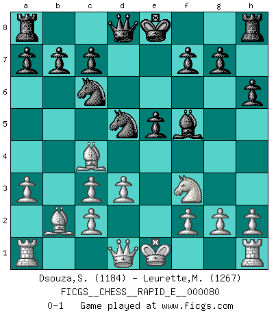 Last move : 0-1 2012 May 20 13:45:58 [Event "FICGS__CHESS__RAPID_E__000080"] [Site "FICGS"] [Date "2012.04.09"] [Round "1"] [White "Dsouza,Stanislaus"] [Black "Leurette,Marc-Antoine"] [Result "0-1"] [WhiteElo "1184"] [BlackElo "1267"] 1.e4 e5 2.Nf3 Nc6 3.Bc4 Nf6 4.d3 h6 5.Nc3 Bb4 6.a3 Bxc3+ 7.bxc3 d5 8.exd5 Nxd5 9.Bb2 Bf5 0-1 This chess game has been lost on time (started : 2012.04.09 17:38:23) Two knights defense (Modern Bishop's Opening) Player Black won this chess game. Follow this game move after move (download)A passed Pawn increases in strength as the number of pieces on the board diminishes. (Capablanca) Das ganze Leben mit einer Ehefrau ist wie ein Endspiel mit ungleichfarbigen Läufern. (Viktor Kortschnoi) La belleza de un movimiento no se refleja solo en su apariencia, sino en el pensamiento detrás de él. (Siegbert Tarrasch) Une platitude souvent récitée à propos des Echecs est qu'une des choses les plus difficiles à réaliser est de gagner une position gagnante. Cela ne manque pas de sens mais, pour ma part, j'ai toujours trouvé plus difficile de gagner une position perdante. (Tim Krabbe) If you work for a living, why do you kill yourself working ? (Tuco to a chicken in The Good, The Bad and The Ugly)