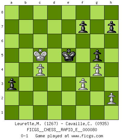 Last move : 0-1 2012 April 19 18:5:3 [Event "FICGS__CHESS__RAPID_E__000080"] [Site "FICGS"] [Date "2012.04.09"] [Round "1"] [White "Leurette,Marc-Antoine"] [Black "Cavaille,Cedric"] [Result "0-1"] [WhiteElo "1267"] [BlackElo "0935"] 1.e4 c5 2.Nc3 d6 3.Bb5+ Bd7 4.Bxd7+ Nxd7 5.Nf3 Ngf6 6.O-O e6 7.d4 cxd4 8.Nxd4 e5 9.Nf3 Be7 10.Nd5 Nxd5 11.Qxd5 b6 12.Ng5 O-O 13.b3 Bxg5 14.Ba3 Be7 15.Bxd6 Bxd6 16.Qxd6 Nf6 17.Qxe5 Qe8 18.Qf4 Qxe4 19.Qxe4 Nxe4 20.c4 Rfd8 21.f3 Nc3 22.Rf2 Rd7 23.Rc2 Rd3 24.a4 a6 25.b4 Rb8 26.Ra3 Rd1+ 27.Kf2 Nb1 28.Ra1 Rbd8 29.Re2 Nc3 30.Rxd1 Nxd1+ 31.Ke1 Nc3 32.Rd2 Rxd2 33.Kxd2 Nxa4 34.g4 a5 35.bxa5 bxa5 36.Kc2 g5 37.Kb3 Nc5+ 38.Ka3 Kg7 39.Kb2 Kf6 40.Kc3 a4 41.Kb4 Ke5 42.Kxc5 a3 0-1 Sicilian : Closed Kingside Castling by player White (move 6) Kingside Castling by player Black (move 12) 10 pieces endgame at move 42 : White KPPPP , Black KPPPP WHITE : King + 4 Pawns BLACK : King + 4 Pawns Player Black won this chess game. Follow this game move after move (download)What is the object of playing a gambit opening?... To acquire a reputation of being a dashing player at the cost of losing a game. (Siegbert Tarrasch) Die Arbeit ist etwas Unnatürliches. Die Faulheit allein ist göttlich. (Anatole France) Un Peón pasado aumenta su poder a medida de que el número de piezas en el tablero disminuye. (Capablanca) Tout change constamment, y compris dans le monde des Echecs. (Botvinnik) There is no instance of a country having benefited from prolonged warfare. (Sun Tzu)