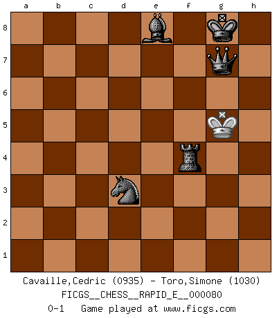 Last move : 0-1 2012 May 4 18:25:25 [Event "FICGS__CHESS__RAPID_E__000080"] [Site "FICGS"] [Date "2012.04.09"] [Round "1"] [White "Cavaille,Cedric"] [Black "Toro,Simone"] [Result "0-1"] [WhiteElo "0935"] [BlackElo "1030"] 1.e4 e5 2.Nf3 Nc6 3.Bc4 Nf6 4.Ng5 d5 5.exd5 Nxd5 6.Bxd5 Qxd5 7.Nf3 Bc5 8.Nc3 Qd8 9.d3 O-O 10.O-O Re8 11.a3 a6 12.b4 Bd4 13.Nxd4 Qxd4 14.Bb2 Bg4 15.Qc1 Qd6 16.Ne4 Qg6 17.Qg5 Bd7 18.Qxg6 hxg6 19.Nc5 Bc8 20.c3 Bf5 21.Rfe1 e4 22.Nxe4 Ne5 23.h3 Nxd3 24.Re2 Bxe4 25.f3 Bd5 26.Rxe8+ Rxe8 27.Rd1 Bc4 28.g4 Nxb2 29.Rd7 Re1+ 30.Kg2 Re3 31.Rxc7 Rxc3 32.Rxb7 Rxa3 33.Rb8+ Kh7 34.Kg3 Bb5 35.Rb7 Ra4 36.Rxf7 Rxb4 37.h4 a5 38.f4 Kg8 39.Re7 a4 40.h5 gxh5 41.gxh5 a3 42.Kg4 Nd3 43.Re3 a2 44.h6 a1Q 45.Re8+ Bxe8 46.hxg7 Rxf4+ 47.Kg5 Qxg7+ 0-1 Two knights defense Kingside Castling by player Black (move 9) Kingside Castling by player White (move 10) 10 pieces endgame at move 41 : White KRPP , Black KRBNPP WHITE : King + 1 Rook 2 Pawns BLACK : King + 1 Rook 1 Bishop 1 Knight 2 Pawns Promotion Queen by player Black (move 44) 9 pieces endgame at move 45 : White KPP , Black KQRBNP WHITE : King + 2 Pawns BLACK : King + 1 Queen 1 Rook 1 Bishop 1 Knight 1 Pawn 8 pieces endgame at move 46 : White KPP , Black KQRBN WHITE : King + 2 Pawns BLACK : King + 1 Queen 1 Rook 1 Bishop 1 Knight 7 pieces endgame at move 46 : White KP , Black KQRBN WHITE : King + 1 Pawn BLACK : King + 1 Queen 1 Rook 1 Bishop 1 Knight 6 pieces endgame at move 47 : White K , Black KQRBN WHITE : King + BLACK : King + 1 Queen 1 Rook 1 Bishop 1 Knight Player Black won this chess game. Follow this game move after move (download)Chess demands total concentration. (Bobby Fischer) Man braucht nicht immer den besten Zug zu spielen: Ein Zug muß aktiv, unternehmungslustig, korrekt und schön sein. (David Bronstein) Ciertamente el estado mental actual de Bobby Fischer es una tragedia. Uno de los mas grandes jugadores de Ajedrez del mundo -el orgullo y pena del Ajedrez Americano. (Frank Brady) Les échecs, c'est la lutte contre l'erreur. (Johannes Zukertort) You cannot beat a roulette table unless you steal money from it. (Albert Einstein)