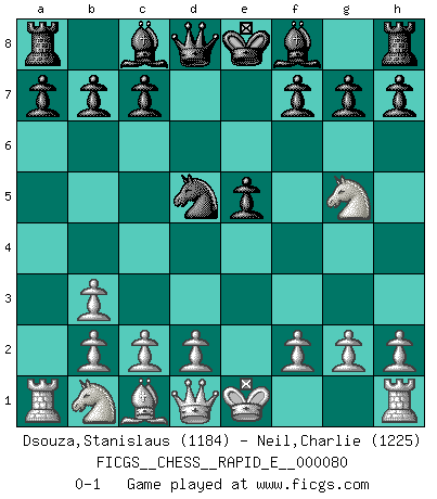 Last move : 0-1 2012 May 21 13:55:17 [Event "FICGS__CHESS__RAPID_E__000080"] [Site "FICGS"] [Date "2012.04.09"] [Round "1"] [White "Dsouza,Stanislaus"] [Black "Neil,Charlie"] [Result "0-1"] [WhiteElo "1184"] [BlackElo "1225"] 1.e4 e5 2.Nf3 Nc6 3.Bc4 Nf6 4.Ng5 d5 5.exd5 Na5 6.Bb3 Nxb3 7.axb3 Nxd5 0-1 This chess game has been lost on time (started : 2012.04.09 17:38:23) Two knights defense Player Black won this chess game. Follow this game move after move (download)Chess, like love, is infectious at any age. (Flohr) Kostenjuk hat keinen Sexappeal. (Loek van Wely) El juego del Ajedrez no es solamente una diversión quieta; algunas cualidades muy valuables de la mente se pueden adquirir y cultivar con el, como convertirlos en habitos disponibles para toda ocasión; ya que la vida es algo así como el Ajedrez. (Benjamin Franklin) La vérité est comme le meilleur coup aux échecs : elle existe, mais il faut la chercher. (Arturo Perez-Reverte) Creativity is allowing yourself to make mistakes. Art is knowing which ones to keep. (Scott Adams)