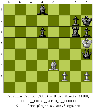 Last move : 0-1 2012 April 16 22:59:38 [Event "FICGS__CHESS__RAPID_E__000080"] [Site "FICGS"] [Date "2012.04.09"] [Round "1"] [White "Cavaille,Cedric"] [Black "Bromo,Alexis"] [Result "0-1"] [WhiteElo "0935"] [BlackElo "1188"] 1.e4 e5 2.Nf3 Nc6 3.Bc4 h6 4.a3 Nf6 5.Nc3 a6 6.b4 b5 7.Bb3 d6 8.a4 Be6 9.axb5 axb5 10.Rxa8 Qxa8 11.Nxb5 Qb7 12.Bxe6 fxe6 13.Nc3 Nxb4 14.O-O Nxe4 15.Nxe4 Qxe4 16.d3 Qc6 17.Bd2 Nxc2 18.Qc1 e4 19.dxe4 Qxe4 20.Ne1 Nd4 21.Qxc7 Be7 22.Qc8+ Bd8 23.Nf3 O-O 24.Re1 Nxf3+ 25.gxf3 Qxf3 26.Qxe6+ Kh8 27.Be3 Ba5 28.Rd1 Qxd1+ 29.Kg2 Rf6 30.Qe8+ Kh7 31.Qe4+ Rg6+ 32.Kh3 Qf1+ 33.Kh4 Bd8+ 34.Kh5 Qh3+ 35.Qh4 Qxh4+ 0-1 King's pawn game Kingside Castling by player White (move 14) Kingside Castling by player Black (move 23) Player Black won this chess game. Follow this game move after move (download)What would Chess be without silly mistakes ? (Kurt Richter) Ich würde die 30 stärksten Spieler der USA im Simultanspiel besiegen. (José Raúl Capablanca) Algunos sacrificios son sólidos, los demás son míos. (Mikhail Tal) Le joueur d'Echecs qui veut atteindre le top est obligé de développer son propre credo créatif. Alexeï Stepanovicth Souétine. Il est facile d'écrire des livres ! Ce qui est difficile, c'est de jouer ! (Alexeï Stepanovicth Souétine) Depression is just anger without enthusiasm. (Unknown)