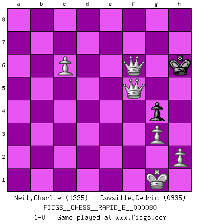 Last move : 1-0 2012 May 10 23:57:47 [Event "FICGS__CHESS__RAPID_E__000080"] [Site "FICGS"] [Date "2012.04.09"] [Round "1"] [White "Neil,Charlie"] [Black "Cavaille,Cedric"] [Result "1-0"] [WhiteElo "1225"] [BlackElo "0935"] 1.e4 c5 2.Nc3 d6 3.g3 Nf6 4.Bg2 e6 5.Nf3 Be7 6.d4 cxd4 7.Nxd4 O-O 8.O-O Nc6 9.Be3 Nxd4 10.Bxd4 a6 11.Qe2 b5 12.e5 dxe5 13.Bxe5 Bd6 14.Bxa8 Bxe5 15.Qxe5 Qd7 16.Bg2 Bb7 17.Rfd1 Qc8 18.a3 Bxg2 19.Kxg2 Rd8 20.Rxd8+ Qxd8 21.Rd1 Nd5 22.Nxd5 exd5 23.Rxd5 Qa8 24.Kg1 h6 25.Rd7 Qf8 26.Re7 a5 27.Re8 b4 28.Rxf8+ Kxf8 29.Qxa5 bxa3 30.Qxa3+ Kg8 31.c4 g5 32.b4 Kg7 33.Qf3 Kg6 34.c5 f5 35.b5 g4 36.Qd5 Kg5 37.b6 h5 38.c6 h4 39.b7 hxg3 40.fxg3 Kh5 41.Qxf5+ Kh6 42.b8Q Kg7 43.Qb8e5+ Kh6 44.Qe5f6+ 1-0 Sicilian : Closed Kingside Castling by player Black (move 7) Kingside Castling by player White (move 8) 10 pieces endgame at move 39 : White KQPPPP , Black KPPP WHITE : King + 1 Queen 4 Pawns BLACK : King + 3 Pawns 9 pieces endgame at move 40 : White KQPPPP , Black KPP WHITE : King + 1 Queen 4 Pawns BLACK : King + 2 Pawns 8 pieces endgame at move 41 : White KQPPPP , Black KP WHITE : King + 1 Queen 4 Pawns BLACK : King + 1 Pawn Promotion Queen by player White (move 42) Player White won this chess game. Follow this game move after move (download)There are two classes of men; those who are content to yield to circumstances and who play whist; those who aim to control circumstances, and who play Chess. (Mortimer Collins) Was ist der Unterschied zwischen einem Strassenarbeiter und einem Schachspieler? --Der Schachspieler bewegt sich ab und zu. (Anonymous) Dios mío, Bobby Fischer juega tan simple. (Alexei Suetin) Je ne suis pas le dernier à jouer lâchement des coups douteux pendant le zeïtnot de l'adversaire pour l'achever: en effet les coups qui font le plus peur sont ceux que l'on ne comprend pas. Je me fais souvent peur quand je joue. (Un professeur anonyme) Live, lose, and learn, by observing your opponent how to win. (Amber Steenbock)
