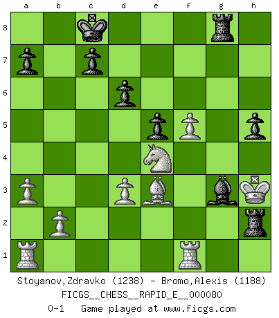 Last move : 0-1 2012 April 10 22:13:31 [Event "FICGS__CHESS__RAPID_E__000080"] [Site "FICGS"] [Date "2012.04.09"] [Round "1"] [White "Stoyanov,Zdravko"] [Black "Bromo,Alexis"] [Result "0-1"] [WhiteElo "1238"] [BlackElo "1188"] 1.e4 e5 2.Nf3 Nc6 3.Bb5 d6 4.Bxc6+ bxc6 5.h3 Nf6 6.d3 Bb7 7.a3 c5 8.Be3 h6 9.Nbd2 Be7 10.O-O Qd7 11.Re1 O-O-O 12.Nc4 g5 13.Nh2 Rdg8 14.f3 h5 15.Na5 g4 16.h4 gxf3 17.Qxf3 Ng4 18.Qxf7 Nxh2 19.Kxh2 Qg4 20.Qf5+ Qxf5 21.exf5 Bxh4 22.Rf1 Rxg2+ 23.Kh3 Bg3 24.Nxb7 Rxc2 25.Nxc5 Rg8 26.Ne4 Rh2+ 0-1 Ruy Lopez : Old Steinitz defense Kingside Castling by player White (move 10) Queenside Castling by player Black (move 11) Player Black won this chess game. Follow this game move after move (download)Play the opening like a book, the middle game like a magician, and the endgame like a machine. (Spielmann) Alle Schachspieler sollten auch ein Hobby haben. (Savielly Grigorievitsch Tartakower) Cuando tu casa esta en llamas, no puedes ser molestado por tus vecinos. O, como decinos en Ajedrez, si tu Rey esta bajo ataque, no te preocupa perder un Peón del lado de la Reina. (Gary Kasparov) Si je n'étais pas joueur d'échecs, je serais le meilleur dans quelque chose d'autre. (Anatoli Karpov) The Internet is the first thing that humanity has build that humanity doesn't understand, the largest experiment in anarchy that we have ever had. (Eric Schmidt)