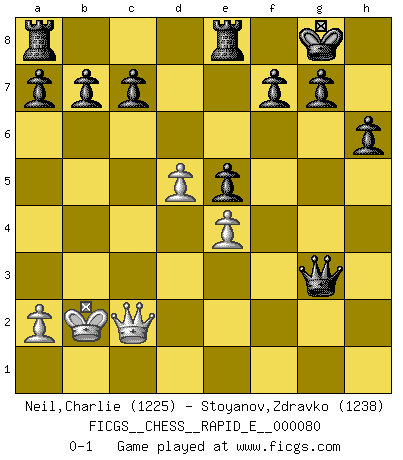 Last move : 0-1 2012 May 19 16:53:57 [Event "FICGS__CHESS__RAPID_E__000080"] [Site "FICGS"] [Date "2012.04.09"] [Round "1"] [White "Neil,Charlie"] [Black "Stoyanov,Zdravko"] [Result "0-1"] [WhiteElo "1225"] [BlackElo "1238"] 1.d4 d5 2.c4 dxc4 3.Nc3 e6 4.e3 Bb4 5.Bxc4 Nf6 6.Nf3 Ne4 7.Qc2 Nxc3 8.bxc3 Bd6 9.O-O h6 10.Bb2 O-O 11.Bd3 Qf6 12.Bh7+ Kh8 13.Bd3 Kg8 14.e4 e5 15.Rfe1 Re8 16.d5 Nd7 17.c4 Bc5 18.Rab1 Nb6 19.Kf1 Bg4 20.Be2 Nd7 21.Qa4 Nb6 22.Qc2 Bxf3 23.Bxf3 Qh4 24.g3 Qxh2 25.Ke2 Qxf2+ 26.Kd1 Qxf3+ 27.Kc1 Be3+ 28.Rxe3 Qxe3+ 29.Kd1 Qg1+ 30.Kd2 Nxc4+ 31.Kc3 Qd4+ 32.Kb3 Nd2+ 33.Ka3 Qe3+ 34.Bc3 Nxb1+ 35.Qxb1 Qxc3+ 36.Qb3 Qc5+ 37.Kb2 Qf2+ 38.Qc2 Qxg3 0-1 Queen's gambit accepted Kingside Castling by player White (move 9) Kingside Castling by player Black (move 10) Player Black won this chess game. Follow this game move after move (download)War is the child of passion, passion is the child of narcissism and narcissism is the child. (...) Another game ? (Thibault de Vassal) Ich habe die besten Aussichten, den ersten Preis zu gewinnen - denn jeder muss gegen Steinitz spielen, nur ich nicht! (Wilhelm Steinitz) Todavía soy una víctima del Ajedrez. Tiene toda la belleza del arte y mucho mas. No puede ser comercializado. El Ajedrez es mas puro que el arte en su posición social. (Marcel Duchamp) J'apprécie les joueurs d'est-indienne, c'est grâce à eux que je nourris ma famille depuis tant d'années. (Petrosian) No man has ever achieved immortality in his own life time. (Unknown)