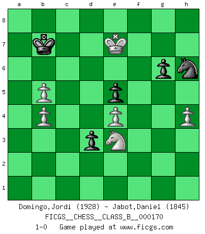 Last move : 1-0 2013 May 16 21:37:18 [Event "FICGS__CHESS__CLASS_B__000170"] [Site "FICGS"] [Date "2012.04.09"] [Round "1"] [White "Domingo,Jordi"] [Black "Jabot,Daniel"] [Result "1-0"] [WhiteElo "1928"] [BlackElo "1845"] 1.e4 c5 2.Nf3 d6 3.d4 cxd4 4.Nxd4 Nf6 5.Nc3 a6 6.Be3 e5 7.Nb3 Be6 8.f3 Be7 9.Qd2 O-O 10.O-O-O Nbd7 11.g4 b5 12.g5 b4 13.Ne2 Ne8 14.f4 a5 15.f5 a4 16.fxe6 axb3 17.cxb3 fxe6 18.Bh3 Rxa2 19.Bxe6+ Kh8 20.Ng3 Nc7 21.Bc4 Qa8 22.Rhf1 Rxf1 23.Rxf1 Ra1+ 24.Kc2 Rxf1 25.Bxf1 d5 26.Qf2 Qc6+ 27.Kb1 d4 28.Bd2 g6 29.h4 Qd6 30.Bd3 Nb6 31.Qf3 Qe6 32.Bf1 Kg7 33.Nh1 Qf7 34.Qxf7+ Kxf7 35.Nf2 Ne6 36.Nd3 Nd7 37.Nxb4 Nec5 38.Bd3 Bd8 39.Kc2 Ke6 40.Na6 Nxd3 41.Kxd3 Kd6 42.Kc4 Kc6 43.Nb4+ Kd6 44.Nd5 Kc6 45.Nb4+ Kd6 46.Nc2 Kc6 47.b4 Nb6+ 48.Kd3 Na4 49.Bc1 Be7 50.b3 Nc3 51.Bf4 Bd6 52.Bh2 Kd7 53.Bg3 Nb5 54.Be1 Bf8 55.Bd2 Kc6 56.Ke2 Nd6 57.Kf3 Kb5 58.Na3+ Kc6 59.Nc4 Nf7 60.Ke2 Kb5 61.Na3+ Kc6 62.Kd3 Nd6 63.Nc4 Nf7 64.Kc2 Kb5 65.Na3+ Kc6 66.b5+ Kb6 67.b4 Nd6 68.Kd3 Be7 69.Be1 Bf8 70.Bg3 Nf7 71.Kc4 h6 72.gxh6 Bxh6 73.Kd5 d3 74.Ke6 Nd8+ 75.Kd7 Nf7 76.Ke7 Bc1 77.Bf2+ Kb7 78.Nc4 Nh6 79.Be3 Bxe3 80.Nxe3 1-0 Sicilian : Najdorf, Byrne (English) attack Kingside Castling by player Black (move 9) Queenside Castling by player White (move 10) Player White won this chess game. Follow this game move after move (download)Capture of the adverse King is the ultimate but not the first object of the game. (William Steinitz) Die Auseinandersetzung mit Karpow war politisch geprägt. Er stand für das kommunistische System, wurde von dessen Repräsentanten gehätschelt. Ich war der Oppositionelle. Jeder Schachweltmeister spiegelt auch die gesellschaftlichen Verhältnisse wider. Kramnik steht für die Börsen-Generation des Neuen Markts, ideologiefrei, zahlenfixiert. (Garry Kasparov) El jugador táctico debe saber que hacer cuando algo se debe de hacer. El estratégico debe saber que hacer cuando nada se debe de hacer. (Savielly Tartakover) Les Echecs sont affaire de jugement sensible. Savoir quand frapper et quand esquiver. (Fischer) 'preceded by its own quotation yields a falsehood' preceded by its own quotation yields a falsehood. (W. V. O. Quine - Set Theory And Its Logic, 1953)