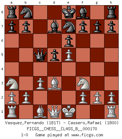 Last move : 1-0 2012 August 22 1:56:54 [Event "FICGS__CHESS__CLASS_B__000170"] [Site "FICGS"] [Date "2012.04.09"] [Round "1"] [White "Vasquez,Fernando"] [Black "Cassero,Rafael"] [Result "1-0"] [WhiteElo "1817"] [BlackElo "1800"] 1.e4 e6 2.d4 d5 3.e5 c5 4.c3 Qb6 5.Nf3 Ne7 6.dxc5 Qxc5 7.Na3 Bd7 8.Bd3 1-0 This chess game has been lost on time (started : 2012.04.09 23:58:20) French : Advance variation Player White won this chess game. Follow this game move after move (download)It is difficult to play against Einstein's theory --on his first loss to Fischer. (Mikhail Tal) Offensichtlich kennt Kasparow nichts anderes als Schach, und ich könnte 500 weitere Spieler dieser Sorte benennen. (Judith Polgar) Con o sin el título, Bobby Fischer fue sin lugar a dudas el mas grande jugador de su época. (Burt Hochberg) Les sacrifices démontrent seulement que quelqu'un a gaffé. (Savielly Tartacover) Once you start thinking you have nothing left to learn, you have everything to learn. (Steve Badget)