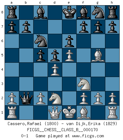 Last move : 0-1 2012 September 10 5:56:40 [Event "FICGS__CHESS__CLASS_B__000170"] [Site "FICGS"] [Date "2012.04.09"] [Round "1"] [White "Cassero,Rafael"] [Black "van Dijk,Erika"] [Result "0-1"] [WhiteElo "1800"] [BlackElo "1829"] 1.e4 e6 2.d4 d5 3.e5 c5 4.Nf3 Nc6 5.Bg5 Qb6 6.Nbd2 Qxb2 0-1 This chess game has been lost on time (started : 2012.04.09 23:58:20) French : Advance, Nimzovich system Player Black won this chess game. Follow this game move after move (download)No price is too great for the scalp of the enemy King. (Koblentz) Der Partner hat auch seine Existenzberechtigung. (Savielly Grigorievitsch Tartakower) Si pudieramos observar el interior de la cabeza de un jugador de Ajedrez, encontraríamos ahí un mundo lleno de sentimientos, imágenes, ideas, emoción y pasión. (Alfred Binet) La vérité est comme le meilleur coup aux échecs : elle existe, mais il faut la chercher. (Arturo Perez-Reverte) The weakness of an artist is dogma. (Josh Waitzkin)