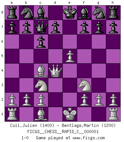 Last move : 1-0 2006 July 8 13:7:32 [Event "FICGS__CHESS__RAPID_C__000001"] [Site "FICGS"] [Date "2006.05.12"] [Round "1"] [White "Coll,Julien"] [Black "Bentlage,Martin"] [Result "1-0"] [WhiteElo "1400"] [BlackElo "1200"] 1.e4 e5 2.Nc3 Nf6 3.Bc4 c6 4.d4 exd4 5.Qxd4 Qc7 6.e5 Ng8 7.Nf3 1-0 This chess game has been lost on time (started : 2006.05.12 15:29:17) Vienna game Player White won this chess game. Follow this game move after move (download)Tactics flow from a superior position. (Bobby Fischer) Glücklicherweise sind Großmeister Ruben Fines reine Schachbücher weniger phallozentrisch [als seine Schachpsychologie] und deswegen auch weniger lächerlich. (Nigel Short) Buenas posiciones no logran ganar juegos, buenas movidas sí. (Gerald Abrahams) Un millionnaire : 'Monsieur Steinitz ! Vous ne participez aux tournois que pour l'argent, alors que moi je n'y viens que pour l'honneur.' Steinitz : 'Chacun joue pour ce qu'il n'a pas'... Luck never made a man wise. (Seneca, Letters to Lucilius)