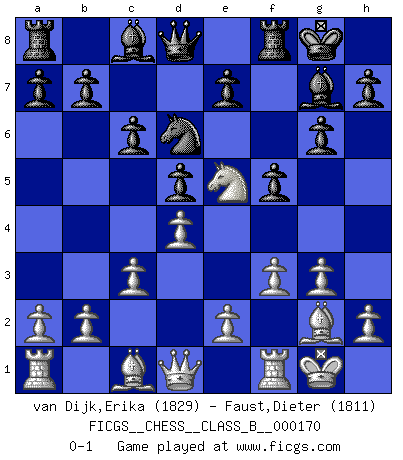 Last move : 0-1 2012 November 2 10:4:40 [Event "FICGS__CHESS__CLASS_B__000170"] [Site "FICGS"] [Date "2012.04.09"] [Round "1"] [White "van Dijk,Erika"] [Black "Faust,Dieter"] [Result "0-1"] [WhiteElo "1829"] [BlackElo "1811"] 1.d4 f5 2.g3 Nf6 3.Bg2 g6 4.Nf3 Bg7 5.O-O O-O 6.Nbd2 c6 7.c3 d5 8.Ne5 Nbd7 9.Ndf3 Nxe5 10.Nxe5 Ne4 11.f3 Nd6 0-1 This chess game has been lost on time (started : 2012.04.09 23:58:20) Dutch defense Kingside Castling by player White (move 5) Kingside Castling by player Black (move 5) Player Black won this chess game. Follow this game move after move (download)All I want to do, ever, is just play Chess. (Bobby Fischer) Ein typischer, sehr verbreiteter Gedankenschädling ist der, daß der betreffende Amateur von der Annanhme ausgeht, daß jeder einzelne Zug etwas zu leisten habe. (Aaron Nimzowitsch) El Ajedrez es un cuento de Hadas de las 1001 metidas de pata. (Savielly Tartakower) La menace est plus forte que l'exécution. (Aaron Nimzovitch) Creativity involves breaking out of established patterns in order to look at things in a different way. (Edward De Bono)