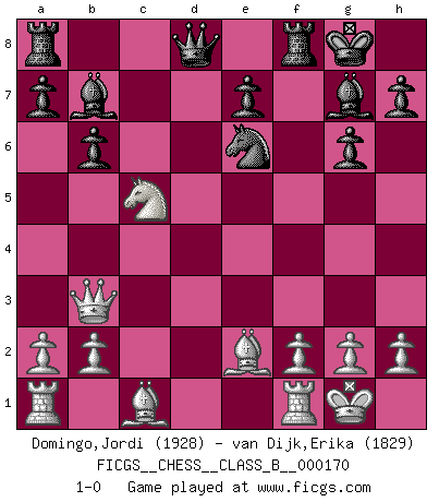 Last move : 1-0 2012 November 6 22:19:37 [Event "FICGS__CHESS__CLASS_B__000170"] [Site "FICGS"] [Date "2012.04.09"] [Round "1"] [White "Domingo,Jordi"] [Black "van Dijk,Erika"] [Result "1-0"] [WhiteElo "1928"] [BlackElo "1829"] 1.e4 c5 2.Nf3 d6 3.c3 Nf6 4.Be2 Nbd7 5.d3 b6 6.Nbd2 Bb7 7.O-O g6 8.d4 cxd4 9.cxd4 Bg7 10.e5 dxe5 11.dxe5 Nd5 12.e6 fxe6 13.Ne4 O-O 14.Nfg5 Nc7 15.Nxe6 Nxe6 16.Qb3 Ndc5 17.Nxc5 1-0 This chess game has been lost on time (started : 2012.04.09 23:58:20) Sicilian Kingside Castling by player White (move 7) Kingside Castling by player Black (move 13) Player White won this chess game. Follow this game move after move (download)Chess is war over the board. The object is to crush the opponents mind. (Bobby Fischer) Die Idee von Capablanca, Schach als Fach in den Schulen zu lehren, ist großartig. (Fidel Castro) Yo tuve un dolor de muelas en la primer partida. En el segundo juego, tuve un dolor de cabeza. En el tercero, tuve un ataque de reumatísmo. En la cuarta partida, no me sentía muy bien. ¿Y en el quinto juego? Bueno, ¿que acaso uno tiene que ganar todos los juegos?. (Siegbert Tarrasch) Il vaut mieux sacrifier les pièces de l'adversaire. (Xavier Tartacover) Coffee just isn't my cup of tea. (Unknown)
