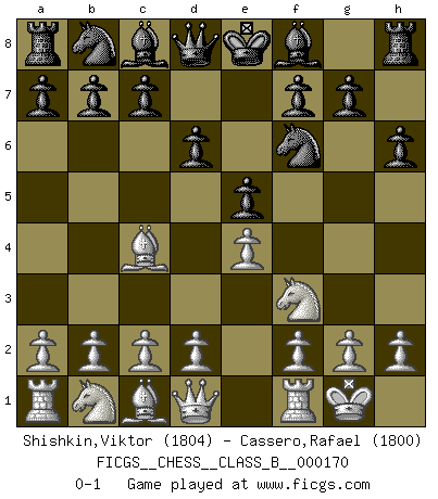 Last move : 0-1 2012 May 30 2:45:52 [Event "FICGS__CHESS__CLASS_B__000170"] [Site "FICGS"] [Date "2012.04.09"] [Round "1"] [White "Shishkin,Viktor"] [Black "Cassero,Rafael"] [Result "0-1"] [WhiteElo "1804"] [BlackElo "1800"] 1.e4 e5 2.Nf3 d6 3.Bc4 h6 4.O-O Nf6 0-1 This chess game has been lost on time (started : 2012.04.09 23:58:20) Philidor's defense Kingside Castling by player White (move 4) Player Black won this chess game. Follow this game move after move (download)We must make sure that Chess will not be like a dead language, very interesting, but for a very small group. (Sytze Faber) Früher wurde jeder komplizierte Zug, jedes interessante Opfer mit großem Beifall und Enthusiasmus aufgenommen. Heute schaltet man einfach seinen Fritz an, und man kann sehen, was los ist, ob der Zug geht oder nicht. (Vladimir Kramnik) Bobby Fischer es el mas grande genio de Ajedrez de todos los tiempos. (Alexander Kotov) Les erreurs sont comme les malheurs, elles n'arrivent jamais seules. (Siegbert Tarrasch) Work expands to fill the time available. (C. Northcote Parkinson, in Parkinson's Laws)