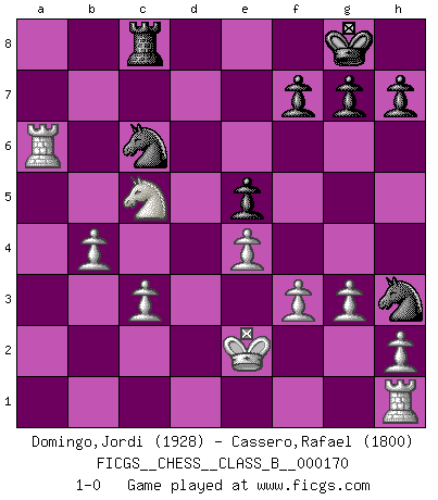 Last move : 1-0 2012 September 11 18:20:1 [Event "FICGS__CHESS__CLASS_B__000170"] [Site "FICGS"] [Date "2012.04.09"] [Round "1"] [White "Domingo,Jordi"] [Black "Cassero,Rafael"] [Result "1-0"] [WhiteElo "1928"] [BlackElo "1800"] 1.e4 c5 2.Nf3 Nc6 3.d4 cxd4 4.Nxd4 e6 5.Nb5 Nf6 6.N1c3 a6 7.Nd6+ Bxd6 8.Qxd6 Qe7 9.Bf4 O-O 10.Qxe7 Nxe7 11.Bd6 Re8 12.Bd3 b5 13.a4 bxa4 14.Nxa4 Ra7 15.f3 Nc6 16.b4 e5 17.c3 Re6 18.Bc5 Ra8 19.Bc4 d6 20.Bxe6 dxc5 21.Bxc8 Rxc8 22.Nxc5 Nh5 23.Rxa6 Nf4 24.g3 Nh3 25.Ke2 1-0 Sicilian defense Kingside Castling by player Black (move 9) Player White won this chess game. Follow this game move after move (download)Chess is a part of culture and if a culture is declining then Chess too will decline. (Mikhail Botvinnik) Jeder Fehler erscheint unglaublich dumm, wenn andre ihn begehen. (Georg Christoph Lichtenberg) Un mal día en el Ajedrez, es mejor que cualquier buen día en el trabajo. (Anonymous) Les échecs sont utiles à l'exercice de la faculté de penser et à celle de l'imagination. Car nous devons posséder une méthode élaborée pour atteindre des buts partout où nous devons conduire notre raison. (Leibnitz) Hold em is to stud what chess is to checkers. (Johnny Moss)