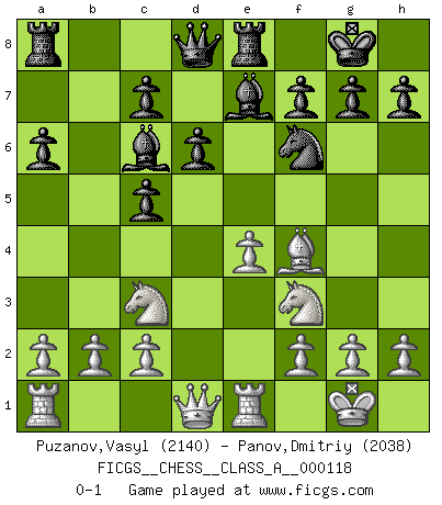 Last move : 0-1 2012 October 14 21:58:23 [Event "FICGS__CHESS__CLASS_A__000118"] [Site "FICGS"] [Date "2012.04.10"] [Round "1"] [White "Puzanov,Vasyl"] [Black "Panov,Dmitriy"] [Result "0-1"] [WhiteElo "2140"] [BlackElo "2038"] 1.e4 e5 2.Nf3 Nc6 3.Bb5 a6 4.Ba4 Nf6 5.O-O Be7 6.Nc3 d6 7.Bxc6+ bxc6 8.d4 exd4 9.Nxd4 Bd7 10.Re1 O-O 11.Be3 c5 12.Nf3 Bc6 13.Bf4 Re8 0-1 This chess game has been lost on time (started : 2012.04.10 21:9:31) Ruy Lopez : Closed defense Kingside Castling by player White (move 5) Kingside Castling by player Black (move 10) Player Black won this chess game. Follow this game move after move (download)The enormous mental resilience, without which no Chess player can exist, was so much taken up by Chess that he could never free his mind of this game. (Albert Einstein) Ein Gewinn durch eine ungenaue Kombination, sei sie auch noch so vorzeigbar, erfüllt mich mit Schaudern. (Wilhelm Steinitz) Observen a Garry Kasparov. Después de una derrota, invariablemente el gana la próxima partida. Prácticamente hace pedazos a su siguiente oponente. Eso es algo que tenemos que aprender a lograr. (Maurice Ashley) Le thème de l'attaque double intervient d'une manière ou d'une autre dans l'immense majorité des combinaisons. (Youri Averbakh) It's not the will to win, but the will to prepare to win that makes the difference. (Bear Bryant)