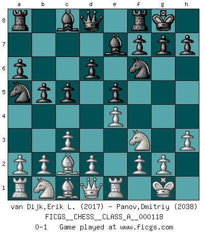 Last move : 0-1 2012 November 1 22:4:49 [Event "FICGS__CHESS__CLASS_A__000118"] [Site "FICGS"] [Date "2012.04.10"] [Round "1"] [White "van Dijk,Erik L."] [Black "Panov,Dmitriy"] [Result "0-1"] [WhiteElo "2017"] [BlackElo "2038"] 1.e4 e5 2.Nf3 Nc6 3.Bb5 a6 4.Ba4 Nf6 5.O-O Be7 6.Re1 b5 7.Bb3 d6 8.c3 O-O 9.h3 Na5 10.Bc2 c5 0-1 Ruy Lopez : Closed Kingside Castling by player White (move 5) Kingside Castling by player Black (move 8) Player Black won this chess game. Follow this game move after move (download)Kasparov : J'adoube , Ivanchuk : S'il vous plaît ! (Garry Kasparov & Vassily Ivanchuk, Linares 1997) Es hat in meinem Leben Zeiten gegeben, da ich sehr nahe daran war zu glauben, daß ich auch nicht eine einzige Schachpartie verlieren könnte. (José Raúl Capablanca) Vive, pierde y aprende al observar a tu oponente como ganar. (Amber Steenbock) D'abord les bases : Jouez et étudiez, puis étudiez et jouez, ensuite jouez et étudiez, puis étudiez et jouez. Deuxièmement : Donnez toujours le meilleur de vous-même ! (Ken Smith) But they are useless. They can only give you answers. (Pablo Picasso, about computers)