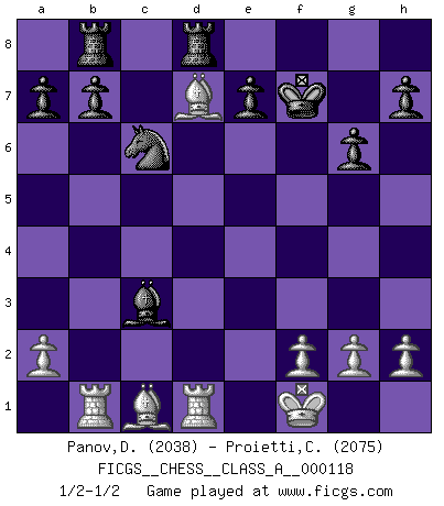 Last move : 1/2-1/2 2012 May 23 6:28:55 [Event "FICGS__CHESS__CLASS_A__000118"] [Site "FICGS"] [Date "2012.04.10"] [Round "1"] [White "Panov,Dmitriy"] [Black "Proietti,Costantino"] [Result "1/2-1/2"] [WhiteElo "2038"] [BlackElo "2075"] 1.e4 c5 2.c3 Nf6 3.e5 Nd5 4.d4 cxd4 5.cxd4 d6 6.Nf3 dxe5 7.dxe5 Nc6 8.Bc4 Be6 9.O-O g6 10.Ng5 Bg7 11.Nxe6 fxe6 12.Nc3 Nxc3 13.bxc3 Qxd1 14.Rxd1 Bxe5 15.Bxe6 Bxc3 16.Bd7+ Kf7 17.Rb1 Rab8 18.Kf1 Rhd8 1/2-1/2 Sicilian : Alapin's variation (2.c3) Kingside Castling by player White (move 9) This chess game ended in a draw. Follow this game move after move (download)Fischer is an American Chess tragedy on par with Morphy and Pillsbury. (Mig Greengard) Dein Körper muss in Topform sein. Dein Schach verfällt, wenn dein Körper verfällt. Der Körper kann nicht vom Geist getrennt werden. (Robert James Fischer) Botvinnik trató de alejar el misterio referente al Ajedrez, siempre relacionandolo a situaciones de la vida diaria. Solía llamar al Ajedrez un problema inexacto típico, similar a aquellos en que la gente tiene siempre que resolver a cada día. (Garry Kasparov) Les Echecs sont et restent toujours un combat, un combat intégral comme la boxe, la lutte ou un autre sport, et où il doit y avoir un vainqueur et un vaincu. (Joseph Emil Diemer) A clear conscience is usually the sign of a bad memory. (Unknown)