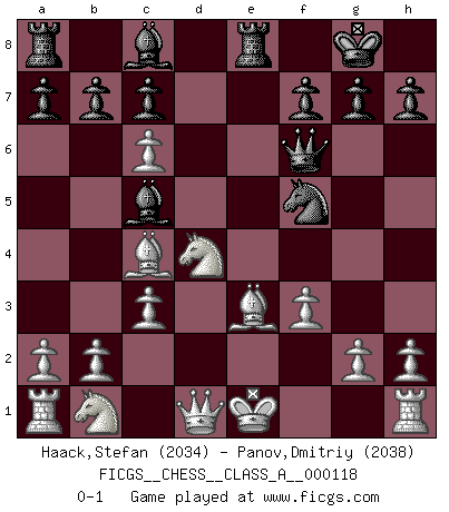 Last move : 0-1 2012 September 12 6:23:1 [Event "FICGS__CHESS__CLASS_A__000118"] [Site "FICGS"] [Date "2012.04.10"] [Round "1"] [White "Haack,Stefan"] [Black "Panov,Dmitriy"] [Result "0-1"] [WhiteElo "2034"] [BlackElo "2038"] 1.e4 e5 2.Nf3 Nc6 3.d4 exd4 4.Nxd4 Bc5 5.Be3 Qf6 6.c3 Nge7 7.f3 O-O 8.Bc4 d5 9.exd5 Re8 10.dxc6 Nf5 0-1 This chess game has been lost on time (started : 2012.04.10 21:9:31) Scotch game Kingside Castling by player Black (move 7) Player Black won this chess game. Follow this game move after move (download)There are tough players and nice guys, and I'm a tough player. (Bobby Fischer) Der beste Spieler in einem Turnier gewinnt es nie. Er landet auf Platz zwei oder drei. (Siegbert Tarrasch) La mitad de las variaciones que son calculadas en una partida de torneo, resultan ser completamente superfluas. Desafortunadamente, nadie sabe por adelantado cual mitad. (Jan Tinman) J'ai toujours senti une vague pitié pour l'homme qui ne connaît rien aux échecs, tout comme j'en aurais pour un homme ignorant de l'amour. Les Echecs, comme la musique ou comme l'amour, ont le pouvoir de rendre heureux. (Siegbert Tarrasch) A shortcut is the longest distance between two points. (Don Groves)