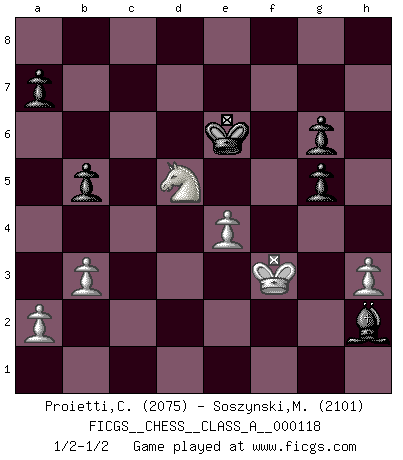 Last move : 1/2-1/2 2012 May 27 14:54:47 [Event "FICGS__CHESS__CLASS_A__000118"] [Site "FICGS"] [Date "2012.04.10"] [Round "1"] [White "Proietti,Costantino"] [Black "Soszynski,Marek"] [Result "1/2-1/2"] [WhiteElo "2075"] [BlackElo "2101"] 1.e4 c6 2.d4 d5 3.exd5 cxd5 4.c4 Nf6 5.Nc3 g6 6.Qb3 dxc4 7.Bxc4 e6 8.d5 Bg7 9.dxe6 Bxe6 10.Bxe6 Qe7 11.Nge2 fxe6 12.Nf4 O-O 13.O-O Nc6 14.Qxe6+ Qf7 15.Bd2 Rae8 16.Qxf7+ Rxf7 17.Rfe1 Rd7 18.Rad1 Red8 19.Be3 Ng4 20.Ne6 Nxe3 21.fxe3 Rxd1 22.Rxd1 Rxd1+ 23.Nxd1 Bf6 24.Nc5 b6 25.Nd3 Kf7 26.Kf2 Ke6 27.Kf3 Kd5 28.N1f2 Ne5+ 29.Nxe5 Bxe5 30.b3 Bg7 31.g4 b5 32.Nd3 Bf6 33.e4+ Ke6 34.Nb4 Bc3 35.Nd5 Be5 36.h3 Bd6 37.g5 Be5 38.Ke3 Bg3 39.Nf6 h6 40.Nd5 hxg5 41.Kf3 Bh2 1/2-1/2 Caro-Kann : Panov-Botvinnik attack, 5...g6 Kingside Castling by player Black (move 12) Kingside Castling by player White (move 13) This chess game ended in a draw. Follow this game move after move (download)The Pawns are the soul of the game. (Francois Andre Danican Philidor) Über Frauen: Chess is better. (Robert James Fischer) Bobby Fischer es el mas grande genio de Ajedrez de todos los tiempos. (Alexander Kotov) Il (Jacob Murray) ne joue pas pour le bon coup, mais pour le meilleur. (Eloi Relange) Men never do evil so completely and cheerfully as when they do it from religious conviction. (Blaise Pascal)
