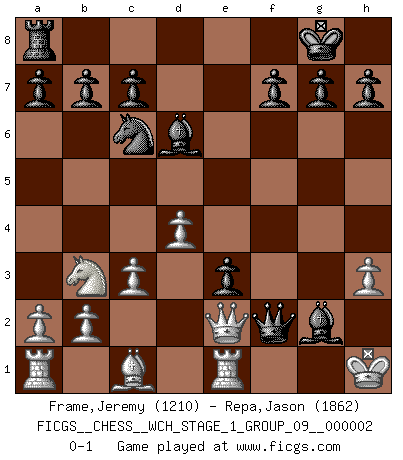 Last move : 0-1 2007 February 5 12:26:39 [Event "FICGS__CHESS__WCH_STAGE_1_GROUP_09__000002"] [Site "FICGS"] [Date "2007.01.16"] [Round "1"] [White "Frame,Jeremy"] [Black "Repa,Jason"] [Result "0-1"] [WhiteElo "1210"] [BlackElo "1862"] 1.e4 e6 2.d4 d5 3.exd5 exd5 4.Nf3 Bg4 5.Nbd2 Bd6 6.Be2 Nc6 7.c3 Nf6 8.h3 Bf5 9.O-O O-O 10.Nb3 Re8 11.Re1 Ne4 12.Bd3 Qf6 13.Bxe4 dxe4 14.Nfd2 Qh4 15.f3 e3 16.Ne4 Rxe4 17.fxe4 Qf2+ 18.Kh1 Bxe4 19.Qe2 Bxg2+ 0-1 French : Exchange variation Kingside Castling by player White (move 9) Kingside Castling by player Black (move 9) Player Black won this chess game. Follow this game move after move (download)It began to feel as though you were playing against Chess itself. - On playing against Robert Fischer. (Walter Shipman) Ein typischer, sehr verbreiteter Gedankenschädling ist der, daß der betreffende Amateur von der Annanhme ausgeht, daß jeder einzelne Zug etwas zu leisten habe. (Aaron Nimzowitsch) Cuando tu casa esta en llamas, no puedes ser molestado por tus vecinos. O, como decinos en Ajedrez, si tu Rey esta bajo ataque, no te preocupa perder un Peón del lado de la Reina. (Gary Kasparov) La solitude du joueur d'Echecs à l'approche du mat est semblable à celle du condamné. (Francis Szpiner) Experiences are the keys to life. (Daniel Parmet)