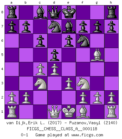 Last move : 0-1 2012 October 17 22:2:32 [Event "FICGS__CHESS__CLASS_A__000118"] [Site "FICGS"] [Date "2012.04.10"] [Round "1"] [White "van Dijk,Erik L."] [Black "Puzanov,Vasyl"] [Result "0-1"] [WhiteElo "2017"] [BlackElo "2140"] 1.d4 d5 2.Nf3 Nf6 3.c4 c6 4.Nc3 e6 5.Bg5 Be7 6.e3 Nbd7 0-1 This chess game has been lost on time (started : 2012.04.10 21:9:31) Queen's pawn game Player Black won this chess game. Follow this game move after move (download)A passed Pawn increases in strength as the number of pieces on the board diminishes. (Capablanca) Jeder Schachmeister war einmal ein Anfänger. (Irving Chernev) Un buen jugador siempre tiene buena suerte. (José Raúl Capablanca) J'ai vu le vaincu d'Echecs jouer des années durant dans l'espoir de la fête de la victoire. Car tu es plus riche de ce qu'elle existe si même elle n'est point pour toi. Ainsi de la perle du fond des mers. (Antoine de Saint-Exupéry) Creativity is inventing, experimenting, growing, taking risks, breaking rules, making mistakes, and having fun. (Mary Lou Cook)