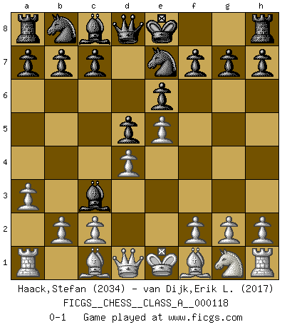 Last move : 0-1 2012 August 16 1:32:4 [Event "FICGS__CHESS__CLASS_A__000118"] [Site "FICGS"] [Date "2012.04.10"] [Round "1"] [White "Haack,Stefan"] [Black "van Dijk,Erik L."] [Result "0-1"] [WhiteElo "2034"] [BlackElo "2017"] 1.e4 e6 2.d4 d5 3.Nc3 Bb4 4.e5 Ne7 5.a3 Bxc3+ 0-1 This chess game has been lost on time (started : 2012.04.10 21:9:31) French : Winawer, Advance variation Player Black won this chess game. Follow this game move after move (download)I am the best player in the world and I am here to prove it. (Bobby Fischer) Im Fernschach kannst du während dem Spiel rauchen. (John Christen Knudsen) El arma más poderosa en el Ajedrez, es tener la próxima movida. (David Bronstein) Avant la finale, les dieux ont créé le milieu de partie. (Tarrasch) Logic : The art of thinking and reasoning in strict accordance with the limitations and incapacities of the human misunderstanding. (Ambrose Bierce)