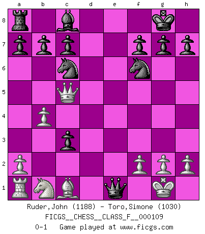 Last move : 0-1 2012 September 16 17:19:43 [Event "FICGS__CHESS__CLASS_F__000109"] [Site "FICGS"] [Date "2012.04.14"] [Round "1"] [White "Ruder,John"] [Black "Toro,Simone"] [Result "0-1"] [WhiteElo "1188"] [BlackElo "1030"] 1.e4 e5 2.Nf3 Nc6 3.Bc4 Bc5 4.O-O Nf6 5.Qe2 O-O 6.d4 exd4 7.Rd1 Re8 8.c3 Rxe4 9.Qd3 d5 10.Re1 dxc4 11.Qxc4 dxc3 12.Qxc5 Qe8 13.b4 Rxe1+ 14.Nxe1 Qxe1+ 0-1 Giuoco Piano Kingside Castling by player White (move 4) Kingside Castling by player Black (move 5) Player Black won this chess game. Follow this game move after move (download)You have to have the fighting spirit. You have to force moves and take chances. (Bobby Fischer) Wie kann ich Remis annehmen? Ich weiß ja gar nicht, wie ich stehe! (Fritz Sämisch) No soy una persona materialista y por eso, no resiento la falta o pérdida del dinero. La ausencia de cosas mundanas carece de importancia. Ya que el Ajedrez es una forma en la que puedo ser tan materialista como yo desee sin tener la necesidad de vender mi alma. (Jamie Walter Adams) Ce qui est bien, c'est d'avoir tout un tas de pièces en prise : l'adversaire ne peut en prendre qu'une à la fois. Cité par Thierry Audin. I have opinions of my own - strong opinions - but I don't always agree with them. (George Bush)