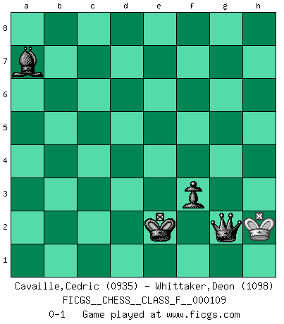 Last move : 0-1 2012 June 4 1:22:13 [Event "FICGS__CHESS__CLASS_F__000109"] [Site "FICGS"] [Date "2012.04.14"] [Round "1"] [White "Cavaille,Cedric"] [Black "Whittaker,Deon"] [Result "0-1"] [WhiteElo "0935"] [BlackElo "1098"] 1.e4 c5 2.Nf3 d6 3.Bc4 e6 4.d4 Nf6 5.dxc5 d5 6.exd5 exd5 7.Bd3 Bxc5 8.Nc3 Qe7+ 9.Qe2 Qxe2+ 10.Nxe2 Bg4 11.a3 O-O 12.b4 Bb6 13.O-O h6 14.Be3 Bc7 15.c4 Bxf3 16.cxd5 Bxd5 17.Bd4 Re8 18.Nf4 Bxf4 19.g3 Bd6 20.Rfe1 Nc6 21.Rxe8+ Rxe8 22.Bxf6 gxf6 23.Bb5 a6 24.Rd1 Re5 25.Ba4 b5 26.Bc2 Kf8 27.h4 Nxb4 28.axb4 Bxb4 29.Kh2 Be4 30.Bxe4 Rxe4 31.f4 a5 32.Rd5 Re3 33.Rxb5 Re2+ 34.Kh3 h5 35.g4 Re3+ 36.Kg2 hxg4 37.Rf5 Rh3 38.Rxf6 Be7 39.Rf5 Bxh4 40.Rxa5 Bg3 41.Ra4 Be1 42.Ra1 Rg3+ 43.Kf1 Bc3 44.Ra3 Rf3+ 45.Ke2 Bd4 46.Rxf3 gxf3+ 47.Kd3 Ba7 48.Kd2 f2 49.Ke2 f5 50.Kf1 Ke7 51.Ke2 Ke6 52.Kf1 Kd5 53.Ke2 Ke4 54.Kf1 Kxf4 55.Kg2 Ke3 56.Kf1 f4 57.Kg2 Ke2 58.Kh2 f3 59.Kh1 f1Q+ 60.Kh2 Qg2+ 0-1 Sicilian Kingside Castling by player Black (move 11) Kingside Castling by player White (move 13) 10 pieces endgame at move 38 : White KRPP , Black KRBPPP WHITE : King + 1 Rook 2 Pawns BLACK : King + 1 Rook 1 Bishop 3 Pawns 9 pieces endgame at move 39 : White KRP , Black KRBPPP WHITE : King + 1 Rook 1 Pawn BLACK : King + 1 Rook 1 Bishop 3 Pawns 8 pieces endgame at move 40 : White KRP , Black KRBPP WHITE : King + 1 Rook 1 Pawn BLACK : King + 1 Rook 1 Bishop 2 Pawns 7 pieces endgame at move 46 : White KRP , Black KBPP WHITE : King + 1 Rook 1 Pawn BLACK : King + 1 Bishop 2 Pawns 6 pieces endgame at move 46 : White KP , Black KBPP WHITE : King + 1 Pawn BLACK : King + 1 Bishop 2 Pawns 5 pieces endgame at move 54 : White K , Black KBPP WHITE : King + BLACK : King + 1 Bishop 2 Pawns Promotion Queen by player Black (move 59) Player Black won this chess game. Follow this game move after move (download)Life is a kind of Chess, with struggle, competition, good and ill events. (Benjamin Franklin) Woher wissen wir, daß der Neanderthaler Blindschach gespielt hat? -- Bei Ausgrabungen wurden keine Schachbretter und Figuren gefunden. (Anonymous) Nunca nadie ha ganado una partida de Ajedrez rindiendose. (Unknown) Les sacrifices démontrent seulement que quelqu'un a gaffé. (Savielly Tartacover) War is the child of passion, passion is the child of narcissism and narcissism is the child. (...) Another game ? (Thibault de Vassal)