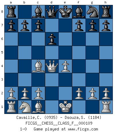 Last move : 1-0 2012 May 25 14:15:5 [Event "FICGS__CHESS__CLASS_F__000109"] [Site "FICGS"] [Date "2012.04.14"] [Round "1"] [White "Cavaille,Cedric"] [Black "Dsouza,Stanislaus"] [Result "1-0"] [WhiteElo "0935"] [BlackElo "1184"] 1.e4 e5 2.Nf3 Nc6 3.Bc4 d6 4.d4 exd4 5.Nxd4 Nxd4 6.Qxd4 1-0 This chess game has been lost on time (started : 2012.04.14 16:12:34) King's pawn game Player White won this chess game. Follow this game move after move (download)When you absolutely don't know what to do anymore, it is time to panic. (John van der Wiel) Du musst Deinen Gegner in einen tiefen dunklen Wald führen wo 2+2=5 ist und wo der Weg, der wieder hinausführt, nur breit genug für einen ist. (Mikhail Nekhemyevich Tal) El jugador táctico sabe que hacer cuando hay algo que hacer; mientras que el estratega sabe que hacer cuando no hay nada que hacer. (Gerald Abrahams) Mais l'homme est une créature légère et illogique : semblable au joueur d'échecs, il n'aime que le processus du but à atteindre, non le but lui-même. (Dostoïevsky) He who defends everything defends nothing. (Frederick the Great)
