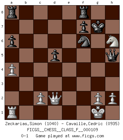 Last move : 0-1 2012 April 29 14:50:14 [Event "FICGS__CHESS__CLASS_F__000109"] [Site "FICGS"] [Date "2012.04.14"] [Round "1"] [White "Zeckarias,Simon"] [Black "Cavaille,Cedric"] [Result "0-1"] [WhiteElo "1040"] [BlackElo "0935"] 1.f4 c5 2.e4 d6 3.Nf3 Nf6 4.Nc3 e6 5.Bc4 Be7 6.d4 cxd4 7.Nxd4 Nc6 8.Nxc6 bxc6 9.O-O d5 10.exd5 cxd5 11.Bb5+ Bd7 12.f5 Bxb5 13.Nxb5 exf5 14.Bg5 O-O 15.a4 a6 16.Nd4 Qe8 17.Re1 Qd8 18.Nc6 Qb6+ 19.Nd4 h6 20.Bxh6 gxh6 21.Rxe7 Qxb2 22.Rb1 Qa3 23.Ra1 Qxe7 24.Nxf5 Qe5 25.Nxh6+ Kg7 26.Qd2 Qh5 0-1 Bird's Opening Kingside Castling by player White (move 9) Kingside Castling by player Black (move 14) Player Black won this chess game. Follow this game move after move (download)Openings teach you openings. Endgames teach you chess ! (Stephan Gerzadowicz) Schach ist die gewalttätigste aller Sportarten. (Garry Kasparov) Si tu oponente te ofrece un empate, trata de averiguar porque piensa él que esta en una posición peor. (Nigel Short) Karpov est une pièce de musée. (Garry Kasparov) Remember : Your focus determines your reality. (Qui-Gon Jinn in Star Wars ep.1)