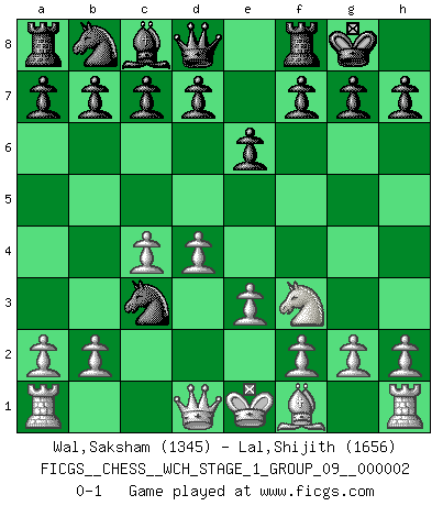 Last move : 0-1 2007 February 23 17:41:11 [Event "FICGS__CHESS__WCH_STAGE_1_GROUP_09__000002"] [Site "FICGS"] [Date "2007.01.16"] [Round "1"] [White "Wal,Saksham"] [Black "Lal,Shijith"] [Result "0-1"] [WhiteElo "1345"] [BlackElo "1656"] 1.d4 e6 2.c4 Nf6 3.Nc3 Bb4 4.Bd2 Bxc3 5.Bxc3 Ne4 6.Nf3 O-O 7.e3 Nxc3 0-1 This chess game has been lost on time (started : 2007.01.16 15:20:23) Queen's pawn Kingside Castling by player Black (move 6) Player Black won this chess game. Follow this game move after move (download)If one piece is badly posted, the whole game is bad. (Tarrasch) Je mehr wir mit Computern analysieren, desto mehr glauben wir an Verteidigung. (Vladimir Kramnik) Un entendimiento minucioso de las típicas continuaciones de mate hacen de las mas complicadas combinaciones de sacrificio que conducen hacia ellas no solo no dificiles, sino casi un asunto de rutina. (Siegbert Tarrasch) Les Echecs sont affaire de jugement sensible. Savoir quand frapper et quand esquiver. (Fischer) Pushing plastic is for the many, pushing virtual pieces is for the fewer, pushing wood is for the very few. (Normajean Yates)