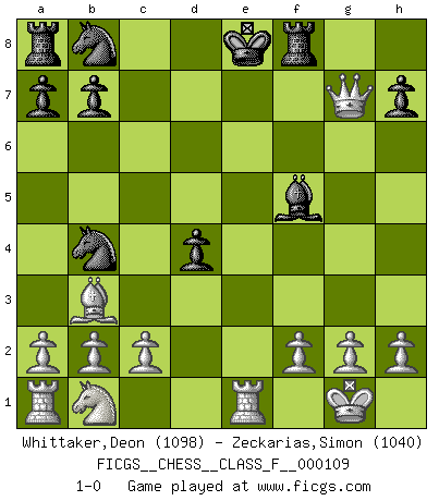 Last move : 1-0 2012 April 26 8:27:3 [Event "FICGS__CHESS__CLASS_F__000109"] [Site "FICGS"] [Date "2012.04.14"] [Round "1"] [White "Whittaker,Deon"] [Black "Zeckarias,Simon"] [Result "1-0"] [WhiteElo "1098"] [BlackElo "1040"] 1.e4 e5 2.Nf3 c5 3.Bc4 Nf6 4.Nxe5 d5 5.exd5 Nxd5 6.d4 Nb4 7.Qh5 g6 8.Bxf7+ Ke7 9.Bg5+ Kd6 10.Qh4 Be7 11.Bxe7+ Qxe7 12.Qf4 Kc7 13.Bb3 Rf8 14.Qg3 cxd4 15.O-O Bf5 16.Nxg6 Kd8 17.Nxe7 Kxe7 18.Qg7+ Ke8 19.Re1+ 1-0 King's knight Opening Kingside Castling by player White (move 15) Player White won this chess game. Follow this game move after move (download)Combinations have always been the most intriguing aspect of Chess. The masters look for them, the public applauds them, the critics praise them. It is because combinations are possible that Chess is more than a lifeless mathematical exercise. They are the poetry of the game; they are to Chess what melody is to music. They represent the triumph of mind over matter. (Reuben Fine) Schach ist Leben. (Robert James Fischer) El arma más poderosa en el Ajedrez, es tener la próxima movida. (David Bronstein) Mais n'est-ce pas déjà le limiter injurieusement que d'appeler les échecs un jeu? N'est-ce pas aussi une science, un art, ou quelque chose qui, comme le cercueil de Mahomet entre ciel et terre, est suspendu entre l'un et l'autre, et qui réunit un nombre incroyable de contraires ? (Stefan Zweig) Optimism is a variety of information deficit. Sometimes especially true for correspondence chess games. (Michael Aigner)