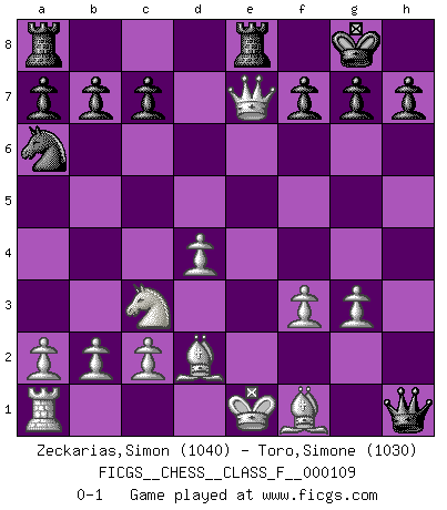 Last move : 0-1 2012 April 18 13:42:43 [Event "FICGS__CHESS__CLASS_F__000109"] [Site "FICGS"] [Date "2012.04.14"] [Round "1"] [White "Zeckarias,Simon"] [Black "Toro,Simone"] [Result "0-1"] [WhiteElo "1040"] [BlackElo "1030"] 1.f4 e5 2.fxe5 d6 3.exd6 Bxd6 4.Nf3 Bg4 5.Nc3 Bxf3 6.exf3 Qh4+ 7.g3 Bxg3+ 8.hxg3 Qxh1 9.Qe2+ Ne7 10.d4 O-O 11.Qxe7 Na6 12.Bd2 Rfe8 0-1 Bird : From gambit Kingside Castling by player Black (move 10) Player Black won this chess game. Follow this game move after move (download)I prefer to lose a really good game than to win a bad one. (David Levy) Taktik ist was man tun muß, wenn etwas zu tun ist. Strategie ist was man tun muß, wenn nichts zu tun ist. (Savielly Grigorievitsch Tartakower) ¿Cual es el objetivo de jugar una apertura de gambito?... Para adquirir una reputación de ser un jugador apuesto a costo de perder el juego. (Siegbert Tarrasch) Les ravages du H expliquent la différence de niveau entre Tal et Thal [Abergel]. Art is not a thing, it is a way. (Elbert Hubbard)