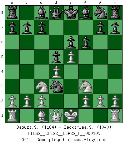 Last move : 0-1 2012 May 29 14:43:39 [Event "FICGS__CHESS__CLASS_F__000109"] [Site "FICGS"] [Date "2012.04.14"] [Round "1"] [White "Dsouza,Stanislaus"] [Black "Zeckarias,Simon"] [Result "0-1"] [WhiteElo "1184"] [BlackElo "1040"] 1.e4 e6 2.Nf3 d5 3.e5 Nc6 4.d4 Nb4 5.Nc3 f6 6.Bd3 Nxd3+ 0-1 This chess game has been lost on time (started : 2012.04.14 16:12:34) French defense Player Black won this chess game. Follow this game move after move (download)I'm not afraid of Spassky. The world knows I'm the best. You don't need a match to prove it. (Bobby Fischer) Fischer: 'Remis!?' Uhlmann: 'Aber es muss doch dreimal Zugwiederholung sein!' Fischer: 'Sie nehmen das Remis an, wie ich es sage, sonst spiele ich weiter und werde Sie dann schlagen!' (Robert James Fischer) Bobby es el jugador de Ajedrez mas fino que este país jamás haya producido. Su memoria para las movidas, su brillantez en soñar combinaciones y su feróz determinación por la victoria son algo extraño. (John Collins) Les réformistes prétendent que les progrès de la théorie conduiront à la disparition des échecs, et qu'il faut, pour leur rendre vie, en remanier les règles. En réalité, qu'exprime cette affirmation? Le mépris de l'intuition, de l'imagination et de tous les autres éléments qui font des échecs un art. (Alexander Alekhine) There is a great deal of difference between an eager man who wants to read a book and a tired man who wants a book to read. (G.K. Chesterton)