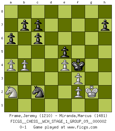 Last move : 0-1 2007 February 18 18:11:3 [Event "FICGS__CHESS__WCH_STAGE_1_GROUP_09__000002"] [Site "FICGS"] [Date "2007.01.16"] [Round "1"] [White "Frame,Jeremy"] [Black "Miranda,Marcus"] [Result "0-1"] [WhiteElo "1210"] [BlackElo "1481"] 1.e4 e5 2.Nf3 Nc6 3.Bb5 a6 4.Bxc6 dxc6 5.d4 exd4 6.Qxd4 Qxd4 7.Nxd4 Bd6 8.O-O f6 9.Nc3 Bd7 10.Nf3 O-O-O 11.Be3 Ne7 12.Rad1 Ng6 13.Bd4 Rhe8 14.Rfe1 Bg4 15.h3 Bxf3 16.gxf3 Nf4 17.h4 Be5 18.Bxe5 fxe5 19.Kh2 Rxd1 20.Rxd1 Rd8 21.Rxd8+ Kxd8 22.Kg3 Ke7 23.Kh2 Kf6 24.a4 g5 25.hxg5+ Kxg5 26.b4 Ne6 27.Kg3 Nd4 28.Na2 Nxc2 29.Kg2 Kf4 0-1 Ruy Lopez : Exchange variation Kingside Castling by player White (move 8) Queenside Castling by player Black (move 10) Player Black won this chess game. Follow this game move after move (download)There are two classes of men; those who are content to yield to circumstances and who play whist; those who aim to control circumstances, and who play Chess. (Mortimer Collins) Woher wissen wir, daß der Neanderthaler Blindschach gespielt hat? -- Bei Ausgrabungen wurden keine Schachbretter und Figuren gefunden. (Anonymous) Una buena ofensiva y una buena defensa, comienzan ambas con un buen desarrollo. (Bruce A. Moon) Le génie consiste à savoir transgresser les règles au moment opportun. (Teichmann) Industry executives and analysts often mistakenly talk about strategy as if it were some kind of chess match. But in chess, you have just two opponents, each with identical resources, and with luck playing a minimal role. The real world is much more like a poker game, with multiple players trying to make the best of whatever hand fortune has dealt them. In our industry, Bill Gates owns the table until someone proves otherwise. (David Moschella, 'Computerworld')