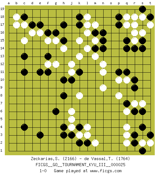 Last move : 1-0 2012 September 6 13:52:27 [Event "FICGS__GO__TOURNAMENT_KYU_III__000025"] [Site "FICGS"] [Date "2012.04.15"] [Round "1"] [Black "Zeckarias,Simon"] [White "de Vassal,Thibault"] [Result "1-0"] [Rating 1 "2166"] [Rating 2 "1764"] 1.c4 q4 2.d17 q17 3.e3 c15 4.c11 c17 5.c18 d16 6.e17 b17 7.h17 e16 8.f16 f15 9.g16 m17 10.r14 r15 11.q15 r16 12.q14 q10 13.n14 r7 14.p17 q18 15.p18 m15 16.s17 s18 17.t18 r17 18.n16 k15 19.s19 r18 20.f13 k13 21.c13 b18 22.k11 m13 23.m16 l16 24.k18 l18 25.k17 l17 26.m14 l14 27.n15 n12 28.p11 n11 29.q11 n9 30.r10 p10 31.r9 p8 32.k4 k8 33.h8 j6 34.g6 j4 35.j3 k3 36.h3 l4 37.k2 l3 38.l2 m2 39.h4 j5 40.r3 q3 41.s4 s2 42.s6 s7 43.r2 q2 44.s1 t2 45.t3 j11 46.j10 j12 47.s15 s16 48.s14 t17 49.h10 g12 50.f11 f12 51.e11 g15 52.h15 h14 53.r6 q6 54.q7 1-0 Here are the names of the openings (joseki) played in the four corners : Corner d16 : d17 c15 Komoku (Somok, Xiao~mu`) 3-4 Point. The komoku (3-4) point is the traditional corner enclosure move.. Ikken Kakari (Hankan Keolch'im, Yi Gua`jiao~, 1-Space Low Pincer). The small knight move is the basic approach move to the 3-4 point stone. It has been continually used for over four centuries. There are limitless variations, with new moves constantly being discovered. White 2 opens the door to a treaure store of joseki. Player Black won this Go (weiqi, baduk) game. Follow this game move after move (download)In the opening, when you don't know what to play, make a shimari. (Jansteen) The intuitive mind is a sacred gift; the rational mind is a faithful servant. We have created a society that honors the servant but has forgotten the gift. (Albert Einstein)
