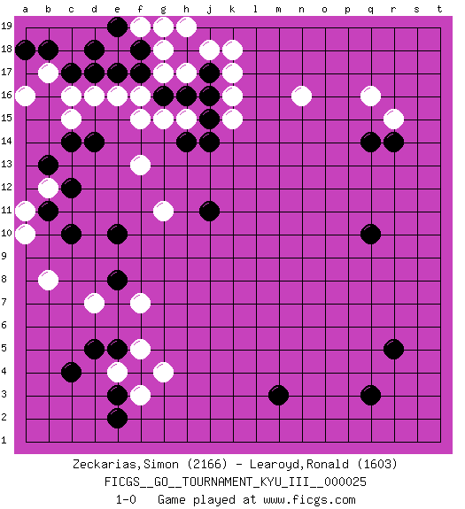 Last move : 1-0 2012 September 15 7:15:30 [Event "FICGS__GO__TOURNAMENT_KYU_III__000025"] [Site "FICGS"] [Date "2012.04.15"] [Round "1"] [Black "Zeckarias,Simon"] [White "Learoyd,Ronald"] [Result "1-0"] [Rating 1 "2166"] [Rating 2 "1603"] 1.c4 q16 2.q3 d16 3.r5 e4 4.e5 f5 5.d5 g4 6.e3 f3 7.e2 f7 8.m3 d7 9.q10 k17 10.r14 r15 11.q14 n16 12.c14 c15 13.d14 f15 14.j16 h17 15.j17 j18 16.h18 k18 17.h16 g17 18.g16 f16 19.f17 g18 20.f18 h19 21.c17 c16 22.d17 b17 23.b18 a16 24.a18 f19 25.e17 e16 26.e19 g19 27.d18 k15 28.h14 h15 29.j15 k16 30.j14 f13 31.c10 b8 32.e10 b12 33.c12 a10 34.b11 a11 35.b13 g15 36.j11 g11 37.e8 1-0 This go game has been lost on time (started : 2012.04.15 14:57:45) Here are the names of the openings (joseki) played in the four corners : Corner d4 : c4 e4 Komoku (Somok, Xiao~mu`) 3-4 Point. The komoku (3-4) point is the traditional corner enclosure move.. Ikken Takagakari (Hankan Nop'dakeolch'im, Yi Gaogua`jiao~, 1-Space High Approach). The 5-4 approach move has become more popular in modern times, as modern Go emphasizes speed and influence. Corner q16 : q16 r14 Hoshi (Hwajeom, Seongjeom, Xingwei`) 4-4 Point. The star or hoshi (4-4) point, emphasizing influence at the potential expense of territory. Ikken Kakari (Hankan Keolch'im, Yi Gua`jiao~, 1-Space Low Approach). Black 2 is the standard approach move to the 4-4. Corner d16 : d16 c14 Hoshi (Hwajeom, Seongjeom, Xingwei`) 4-4 Point. The star or hoshi (4-4) point, emphasizing influence at the potential expense of territory. Ikken Kakari (Hankan Keolch'im, Yi Gua`jiao~, 1-Space Low Approach). Black 2 is the standard approach move to the 4-4. Player Black won this Go (weiqi, baduk) game. Follow this game move after move (download)White is always trying to kill a bigger group than black is trying to save. (Anonymous) There's always a bigger fish. (Qui-Gon Jinn in Star Wars ep.1)