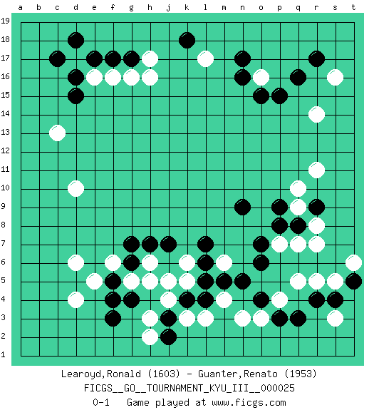 Last move : 0-1 2012 October 10 21:45:39 [Event "FICGS__GO__TOURNAMENT_KYU_III__000025"] [Site "FICGS"] [Date "2012.04.15"] [Round "1"] [Black "Learoyd,Ronald"] [White "Guanter,Renato"] [Result "0-1"] [Rating 1 "1603"] [Rating 2 "1953"] 1.q16 d4 2.q3 d17 3.r9 o16 4.o15 r14 5.p15 s16 6.r17 r11 7.n16 l17 8.n17 h16 9.d15 d10 10.e17 e16 11.d16 q5 12.r4 r5 13.o4 q9 14.q8 r8 15.f17 f16 16.g17 g16 17.c17 h17 18.d18 c13 19.f3 d6 20.j3 m4 21.o6 q7 22.p8 p7 23.o7 r7 24.p9 q10 25.n9 m6 26.j7 j5 27.g6 g5 28.f5 h6 29.g4 h5 30.h7 f6 31.g7 e5 32.f4 k3 33.k4 k5 34.l5 j4 35.l4 l3 36.l6 k6 37.l7 h3 38.j2 h2 39.k18 n3 40.m5 o3 41.p3 p4 42.n5 s3 43.s4 s5 44.t5 t6 0-1 This go game has been lost on time (started : 2012.04.15 14:57:45) Here are the names of the openings (joseki) played in the four corners : Corner q16 : q16 o16 Hoshi (Hwajeom, Seongjeom, Xingwei`) 4-4 Point. The star or hoshi (4-4) point, emphasizing influence at the potential expense of territory. Ikken Takagakari (Hankan Nop'dakeolch'im, Yi Gaojia, 1-Space High Approach). Black typically responds at 6-4 or 3-10. Black 4-10 is played when Black finds play on the right side advantageous. Black 4-8 or 3-8 may be played when Black has support at top. Corner d4 : d4 f3 Hoshi (Hwajeom, Seongjeom, Xingwei`) 4-4 Point. The star or hoshi (4-4) point, emphasizing influence at the potential expense of territory. Ikken Kakari (Hankan Keolch'im, Yi Gua`jiao~, 1-Space Low Approach). Black 2 is the standard approach move to the 4-4. Player White won this Go (weiqi, baduk) game. Follow this game move after move (download)Pon-nuki is worth thirty points. (Anonymous) There are two major products that came out of Berkeley: LSD and UNIX. We do not believe this is to be a coincidence. (Jeremy S. Anderson)