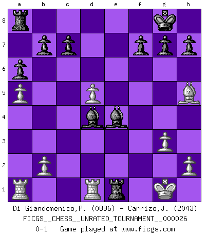 Last move : 0-1 2012 October 14 1:38:23 [Event "FICGS__CHESS__UNRATED_TOURNAMENT__000026"] [Site "FICGS"] [Date "2012.04.16"] [Round "1"] [White "Di Giandomenico,Pierino"] [Black "Carrizo,Jose"] [Result "0-1"] [WhiteElo "0896"] [BlackElo "2043"] 1.e4 e5 2.Be2 Nf6 3.d3 d5 4.exd5 Nxd5 5.Nf3 Nc6 6.O-O Be7 7.Nc3 O-O 8.Be3 Nxe3 9.fxe3 a6 10.d4 exd4 11.exd4 Bf6 12.d5 Ne5 13.a4 Re8 14.Qd4 Nxf3+ 15.Bxf3 Bxd4+ 16.Kh1 Bf5 17.a5 Bxc2 18.Rfc1 Bd3 19.Rd1 Re3 20.Bh5 Qh4 21.g3 Qe4+ 22.Nxe4 Bxe4+ 23.Kg1 Re1+ 0-1 King's pawn game Kingside Castling by player White (move 6) Kingside Castling by player Black (move 7) Player Black won this chess game. Follow this game move after move (download)I look one move ahead... the best ! (Siegbert Tarrasch) Im Leben werden Partien nie so unstrittig gewonnen wie im Spiel (Emanuel Lasker) Las ideas audaces son como las piezas del Ajedrez que avanzan hacia adelante. Ellas pueden ser vencidas, pero también pueden iniciar una partida victoriosa. (Goethe) Aucun coup ne doit être joué sans but. (Pedro Damiano) However beautiful the strategy, you should occasionally look at the results. (Winston Churchill)