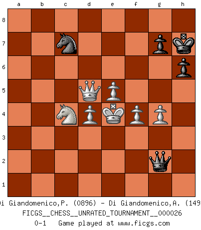 Last move : 0-1 2012 September 21 12:5:25 [Event "FICGS__CHESS__UNRATED_TOURNAMENT__000026"] [Site "FICGS"] [Date "2012.04.16"] [Round "1"] [White "Di Giandomenico,Pierino"] [Black "Di Giandomenico,Alfonso"] [Result "0-1"] [WhiteElo "0896"] [BlackElo "1493"] 1.e4 e5 2.Nc3 Nf6 3.Bd3 Nc6 4.Nf3 Be7 5.O-O O-O 6.Qe2 d6 7.b3 Be6 8.Bb2 Nb4 9.Ba3 Nxd3 10.Qxd3 a6 11.Ng5 Bd7 12.Bb4 h6 13.Nf3 c5 14.Ba3 b5 15.b4 cxb4 16.Bxb4 Be6 17.a4 Bc4 18.Qe3 Bxf1 19.Kxf1 Rc8 20.axb5 axb5 21.Nxb5 Rxc2 22.Qe1 Rb2 23.Rb1 Rxb1 24.Qxb1 Qd7 25.Qd3 Rb8 26.Kg1 Kh8 27.Bxd6 Bxd6 28.Nxd6 Rd8 29.Nxe5 Qc7 30.Nexf7+ Kg8 31.Nxd8 Qxd8 32.e5 Ne8 33.Qd5+ Kh7 34.f4 Qb6+ 35.d4 Qb1+ 36.Kf2 Qc2+ 37.Kg3 Nc7 38.Nc4 Qd3+ 39.Kg4 Qg6+ 40.Kf3 Qh5+ 41.Ke4 Qxh2 42.g4 Qg2+ 0-1 Vienna : Falkbeer variation Kingside Castling by player White (move 5) Kingside Castling by player Black (move 5) Player Black won this chess game. Follow this game move after move (download)The beauty of a move lies not in its' appearance but in the thought behind it. (Siegbert Tarrasch) Smyslow ist ein Beweis dafür, dass ich noch zehn Jahre spielen kann! [der 75 jährige über den 85 jährigen] (Viktor Kortschnoi) En el tablero, la mentira e hipocresía no sobreviven mucho. (Emanuel Lasker) Donnez-moi un Cavalier en 6e et je gagnerais toutes mes parties. (Steinitz) There are more things in heaven and earth than practically anywhere else. (Unknown)