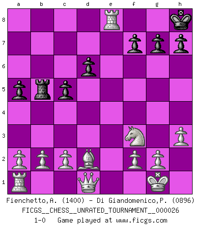 Last move : 1-0 2012 May 7 13:23:46 [Event "FICGS__CHESS__UNRATED_TOURNAMENT__000026"] [Site "FICGS"] [Date "2012.04.16"] [Round "1"] [White "Fienchetto,Andy"] [Black "Di Giandomenico,Pierino"] [Result "1-0"] [WhiteElo "1400"] [BlackElo "0896"] 1.e4 e5 2.Nf3 Be7 3.Nxe5 d6 4.Nf3 Nf6 5.Nc3 O-O 6.d4 Nc6 7.h3 Be6 8.d5 Bxd5 9.exd5 Nxd5 10.Nxd5 Nb4 11.Nxb4 c5 12.Nd5 Qa5+ 13.Bd2 Qc7 14.Nxc7 Rac8 15.Nd5 b6 16.Nxe7+ Kh8 17.Nxc8 Rxc8 18.Bc4 a5 19.O-O Rb8 20.Re1 b5 21.Bxb5 Rxb5 22.Re8+ 1-0 King's knight Opening Kingside Castling by player Black (move 5) Kingside Castling by player White (move 19) Player White won this chess game. Follow this game move after move (download)The winner of the game is the player who makes the next-to-last mistake. (Savielly Tartakover) Es gibt keine einzige Frau, der ich nicht einen Springer vorgeben könnte und trotzdem gewänne. (Robert James Fischer) Me dio la sensación de como si yo estuviera jugando en contra del mismo Ajedrez. - al estar jugando en contra de Robert Fischer (Walter Shipman) Lorsque vous vous retrouvez devant une position atroce, ne tendez pas un ultime piège dérisoire avec l'intention d'abandonner si l'adversaire le déjoue ! Faites-vous plutôt un devoir de résister comme si votre vie en dépendait. Jouez le coup qui vous déplairait au centuple si vous étiez dans la peau de votre tortionnaire ! Go and wake up your luck. (Persian saying)