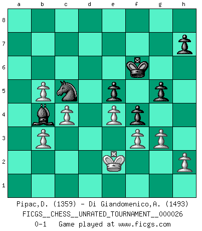 Last move : 0-1 2012 August 24 23:5:16 [Event "FICGS__CHESS__UNRATED_TOURNAMENT__000026"] [Site "FICGS"] [Date "2012.04.16"] [Round "1"] [White "Pipac,Darko"] [Black "Di Giandomenico,Alfonso"] [Result "0-1"] [WhiteElo "1359"] [BlackElo "1493"] 1.e4 c5 2.Nf3 e6 3.Nc3 Nc6 4.d4 cxd4 5.Nxd4 a6 6.a3 Qc7 7.Be2 d6 8.Bf4 Nxd4 9.Qxd4 e5 10.Nd5 Qb8 11.Bxe5 dxe5 12.Qb6 Bd6 13.O-O-O Be6 14.Nb4 Bc7 15.Bb5+ axb5 16.Qxb5+ Kf8 17.Nd5 Bxd5 18.Rxd5 Nf6 19.Qc5+ Kg8 20.Rd3 g6 21.Qe7 Kg7 22.f3 Re8 23.Qc5 b5 24.Rhd1 b4 25.axb4 Ra1+ 26.Kd2 Rxd1+ 27.Kxd1 Rd8 28.Rxd8 Qxd8+ 29.Ke2 Qd6 30.Qxd6 Bxd6 31.c3 Nd7 32.Kd3 f5 33.b3 Kf6 34.b5 f4 35.c4 Bb4 36.g3 g5 37.Ke2 Nc5 0-1 Sicilian defense Queenside Castling by player White (move 13) Player Black won this chess game. Follow this game move after move (download)Methodical thinking is of more use in Chess than inspiration. (C. J. S. Purdy) Ein Schachspiel besteht aus drei Phasen: Die erste, wenn du hofftst den Vorteil zu haben, die zweite, wenn du glaubst einen Vorteil zu haben, und die dritte.... wenn du weißt Du wirst verlieren. (Savielly Grigorievitsch Tartakower) Muchos se han convertido en Maestros de Ajedrez, nadie se ha convertido en el Maestro del Ajedrez. (Siegbert Tarrasch) Je fais ceci parce que dans cinquante coups j'obtiendrai cela; je m'appelle Mikhail Moisevitch Botvinnik. (Botvinnik) Whoever said the pen is mightier than the sword obviously never encountered automatic weapons. (US General Douglas MacArthur)