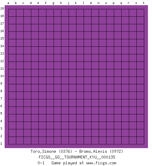 Last move : 0-1 2012 April 17 22:17:41 [Event "FICGS__GO__TOURNAMENT_KYU__000135"] [Site "FICGS"] [Date "2012.04.17"] [Round "1"] [Black "Toro,Simone"] [White "Bromo,Alexis"] [Result "0-1"] [Rating 1 "0376"] [Rating 2 "0972"] 0-1 Here are the names of the openings (joseki) played in the four corners : Player White won this Go (weiqi, baduk) game. Follow this game move after move (download)Always remember, keep the balance. [between territory and influence] (Figaro) Real knowledge is to know the extent of one's ignorance. (Confucius)
